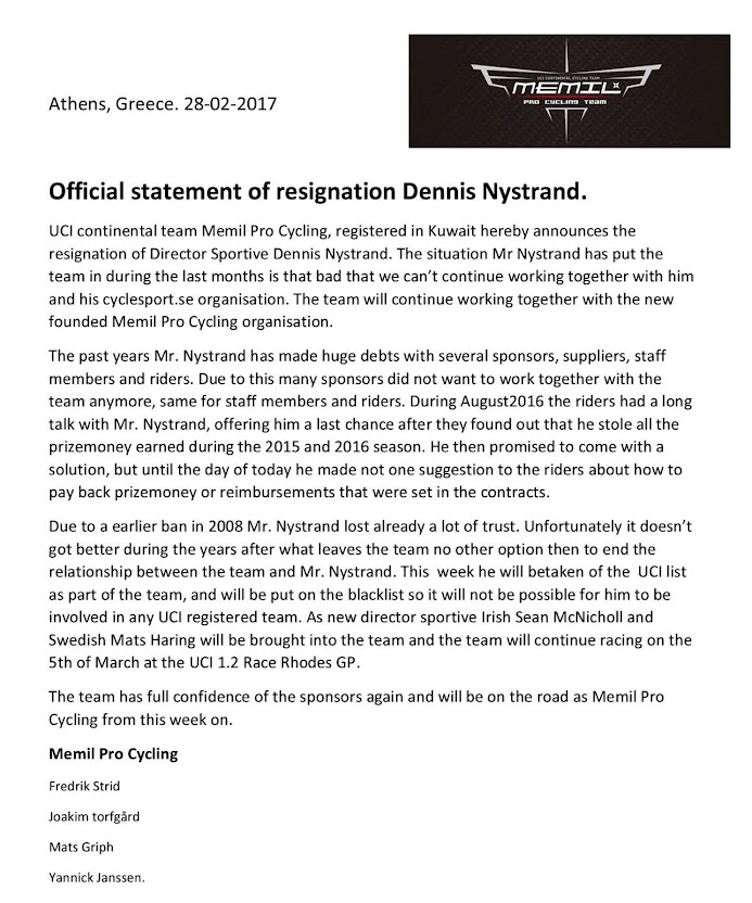 Tallissa tapahtuu, tallipomo on saanut kenkää, syynä ilmeisen omavaltainen ja holtiton taloudenpito (eli ei mitään uutta ammattipyöräilyssä joka varsin usein on ollut amatöörien puuhastelua ja saanut toimia kepulimiesten leikkikenttänäkin; Nystrand on ehkä kuitenkin palava pyöräilyihminen ja ikuinen optimisti kuin sponsorien rahoja omiin taskuihinsa haaliva huijari),