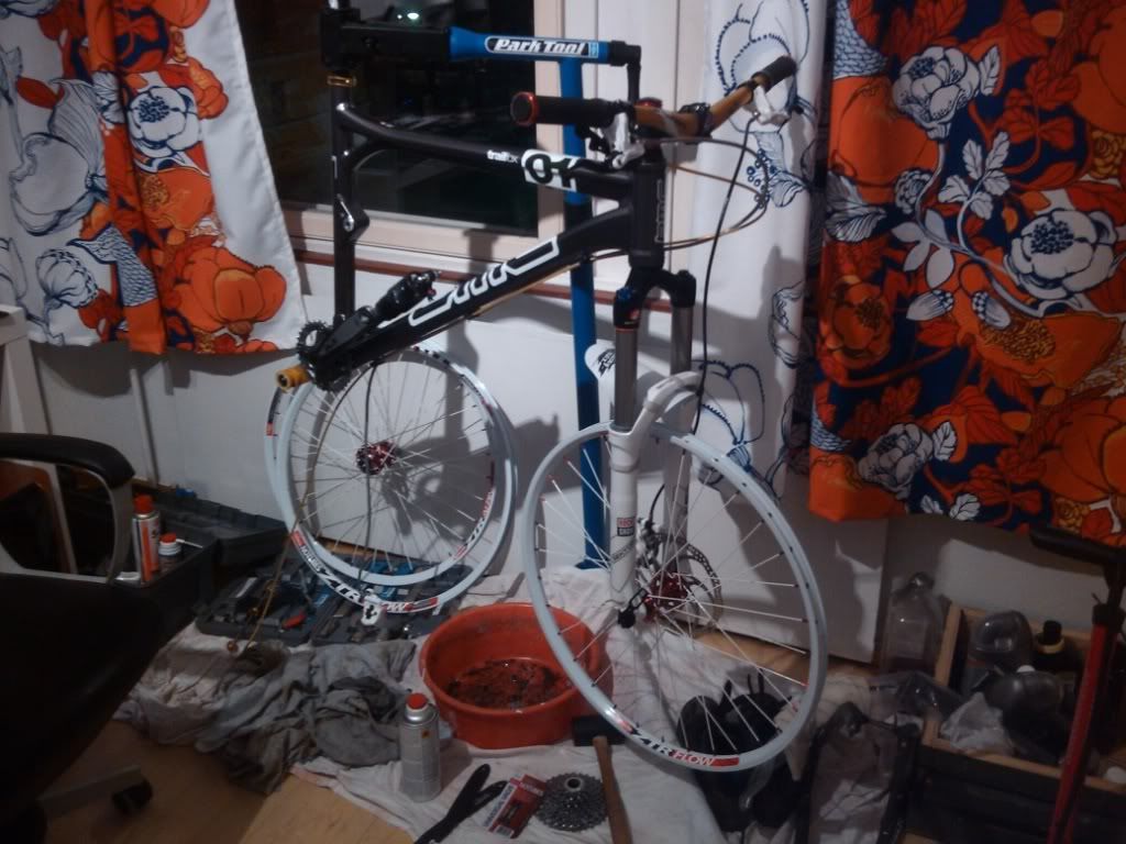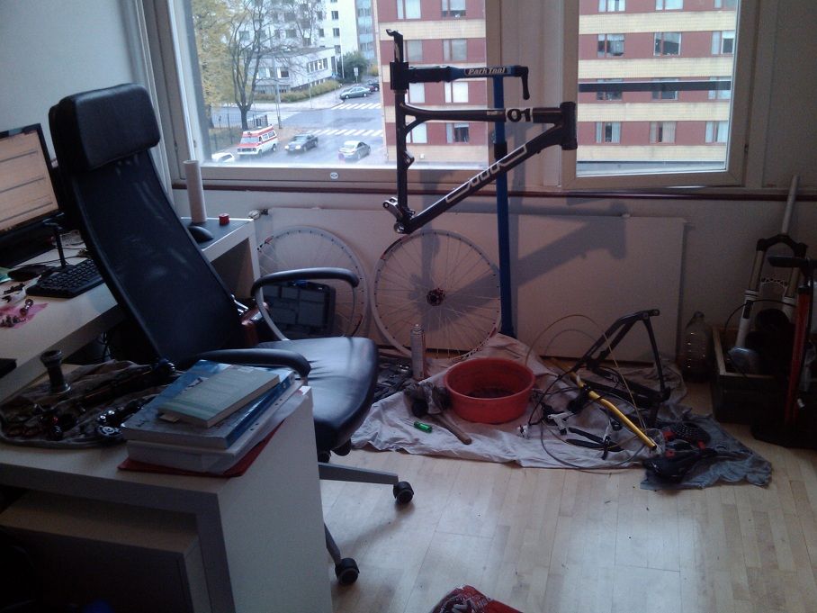 Ei tarvii sanoo muuta kun että mies liikuntakiellossa ja 10m2 huone täynnä fillarin ruuveja ja paloja. Noh, laskelmien mukaan pitäisi keventyä melkein kilon verran. Uudet kiekot, voimansiirto 2x9 -> 1x9 ja sellast pientä hommaa.