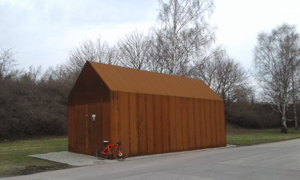 Liekö ruostuvan corten -teräksen käyttö jo liian tavallista, kun ei heti napannut. Avataan kuvakulmaa hieman, jotta mittasuhteet selviävät.