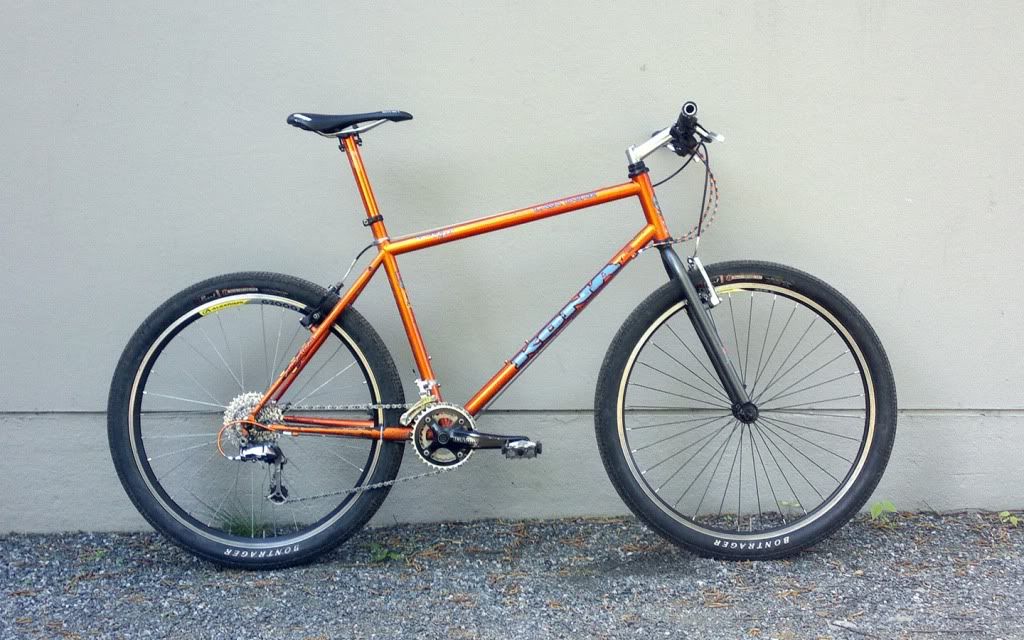 Tollane semi-retro, -96 mallin rungon ja keulan ympärille kasailtu osia vuosien varrelta.. toimiva ja kohtuu keveä kokoonpano, onhan siinä xtr:ää, nokonia, yms. ja rungon sävyyn mätsäävä satulatolppa =)