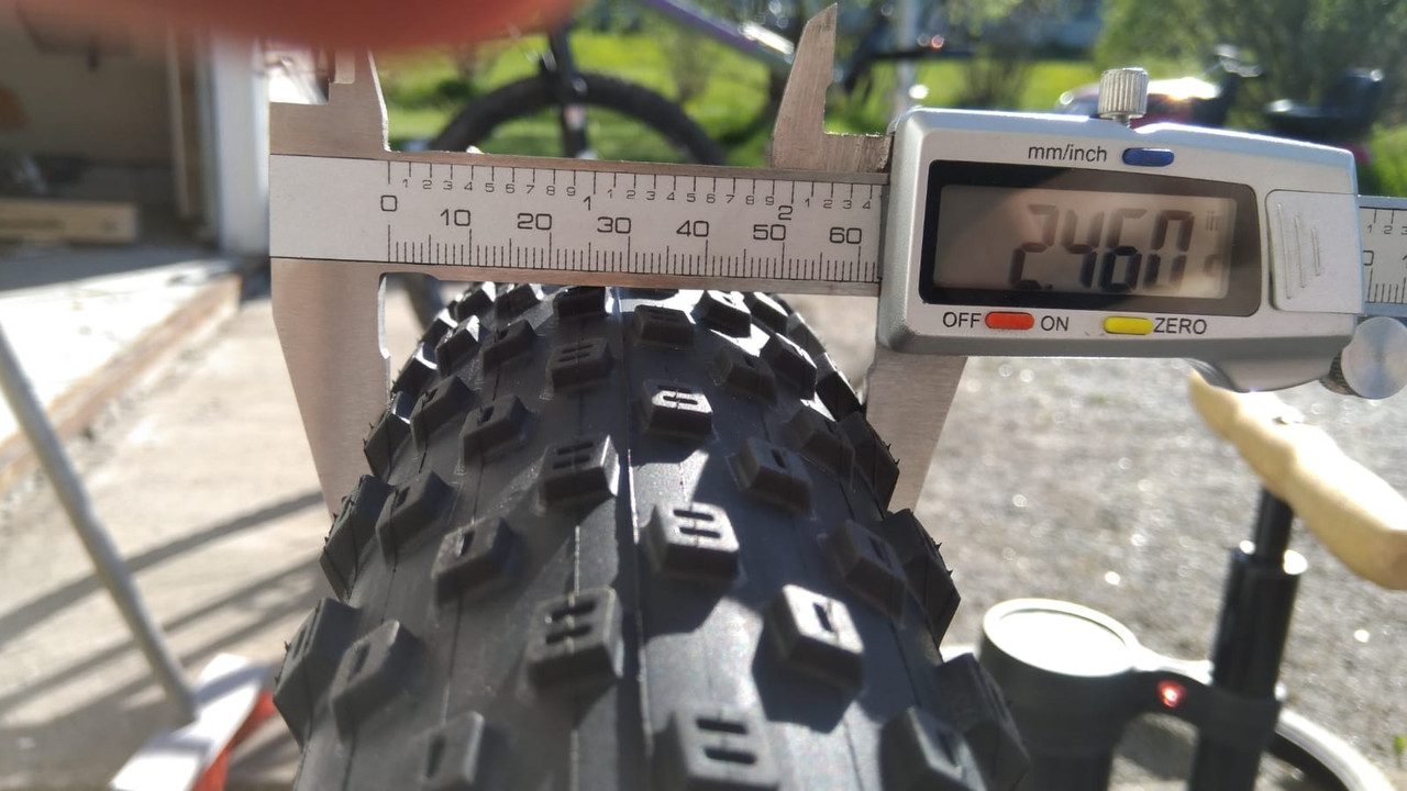 Laitoin tänää uuden DHF 2.5WT taakse, edessä ollu pidempää samanlainen. Kattelin että ompa kaposan näkönen. Mittasin edestä leveimmästä kohdasta 2.6 ja takaata hieman alle 2.5(suoraan kyljestä 2.2 :D )Kyllä ne piruvie vähä venähtää. Tosin edessä eri casing(exo), takana DD.