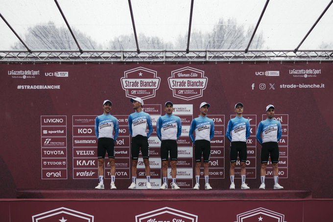 Kuusi kuskia Strade Bianchen tiimiesittelyssä lavalla eilen ja Jaakko puuttui [emoji849]