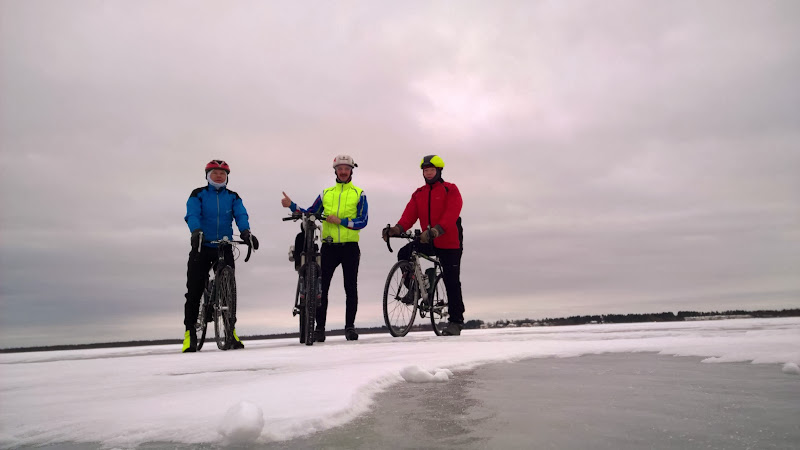 Vihiluodon rannassa kevennettiin pilssivesilastia. Hannu kävi testaamassa jäällä ajamista ja hyvin näytti pyörä liikkuvan. Rannalla tehtiin jako, eli muutama kaveri ajeli Oulunlahden yli jäätä pitkin Oritkariin ja me loput rullailtiin maita pitkin samaan paikkaan. Hyvin oli jää kestänyt poikia ja miehet olivat jo rannalla odottelemassa meitä maakrapuja.