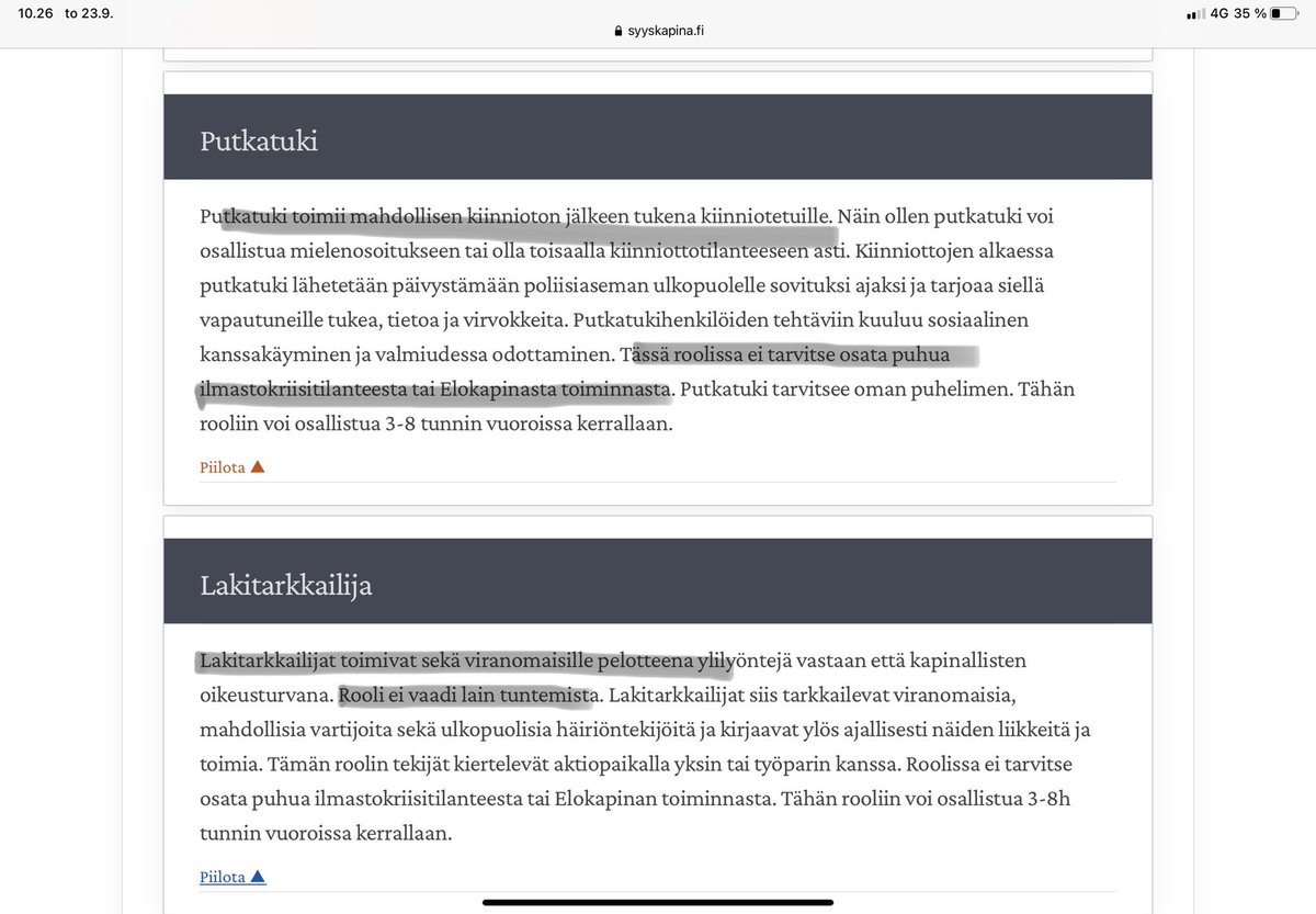 Elokapinalliset värväävät toimintaansa näköjään mukaan kaikenlaisia tukihenkilöitä. Lakitarkkailijoissa ihmetyttää että ei vaadi kuitenkaan lain tuntemusta mutta pitäisi toimia kuitenkin oikeusturvana. Aikovatkohan oikeasti kirjata ylös kaikki poliisien liikkeet ?