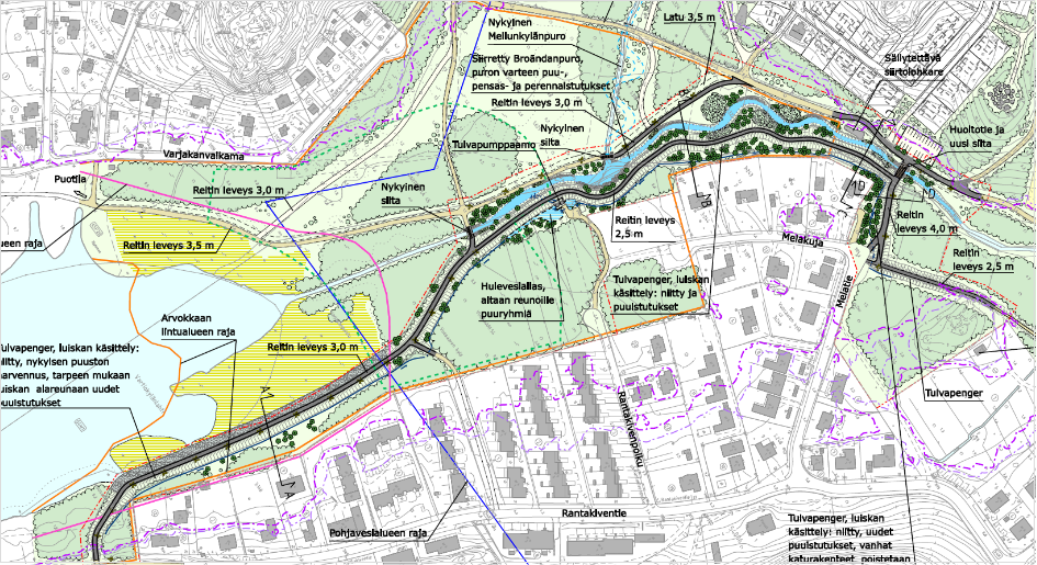 "Suunnittelualueella on merkittäviä luontoarvoja, minkä lisäksi alue on suosittua ulkoilu- ja virkistysaluetta. Suunnitelmassa jouduttiin siirtämään Broändanpuron uomaa tulevan tulvapenkereen alta. Samassa yhteydessä suoraviivaista uomaa muotoiltiin luonnollisemmaksi, mutkittelevaksi puroksi.Ympäristörakentaminen päädyttiin toteuttamaan luonnonmukaisesti käyttäen ainoastaan alueelta talteen otettua pohjamaata kasvualustoissa. Myös alueen luontaista kasvillisuutta otetaan talteen ja siirretään toiseen paikkaan alueella. Tarkoituksena on välttää vieraslajien tulo alueelle ja säilyttää alueen luontoarvot."