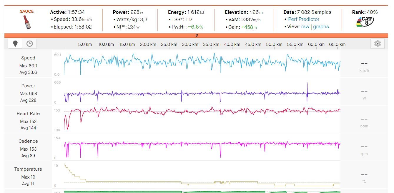 Esimerkiksi tänään söin suht reippaan ruuan tuntia ennen ajoa. Tarkoitus oli ajaa 2h jossain aerokynnyksen tuntumassa fiiliksen mukaan. Syke oli vähän korkeahko heti paukusta, mutta fiilis tuntui hyvältä, joten jatkoin ajoa. Lopputuloksena -6.8 pw/hr ratio. Varmaan tuossa paitakin kastui ja kroppa viileni tuon vuoksi. Alussa oli hivenen kuuma.