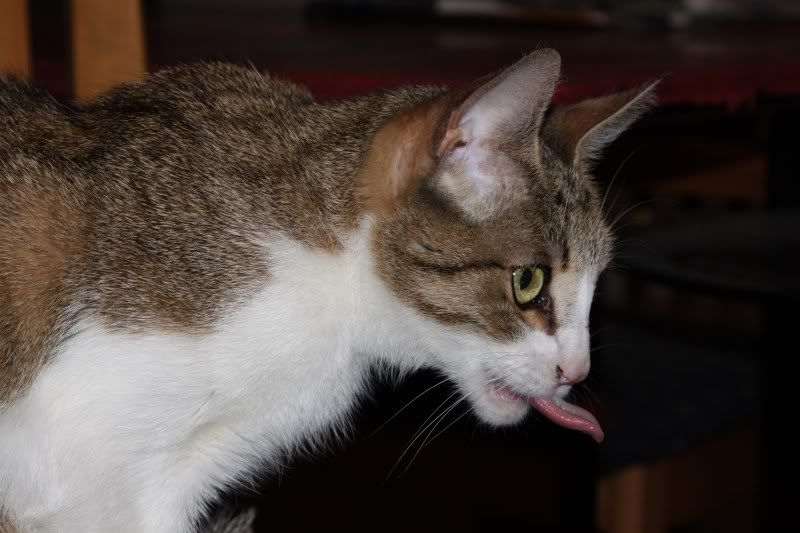 Ja sit hupaisa toinen tapaus. Myyllä on kauhee fetissi lutkuttaa omia(!) tissejään. Jos sitä alkaa silittää ja se alkaa kehrää niin noin 3-5 sekuntia menee kehräyksen aloittamisesta kun se käpertyy rullalle lutkuttamaan tissiään. Nooh, se makoili kiipeilytasolla ja mää menin topleksena siihen silittelemään Viliä joka makasi ylatasolla niin yllätys oli suuri kun kohta alkoi kuulua mums-mums-lutkun-lutkun ja joku märkä tuntui kehossani. Myy lutkuttamassa meikän tissiä. Jeps jeps... Meikä WTF:fänä ja rouva meinas kuolla vieressä nauruun. Mulla ei ollut niin kovin maskuliininen olo siinä. :eek:
