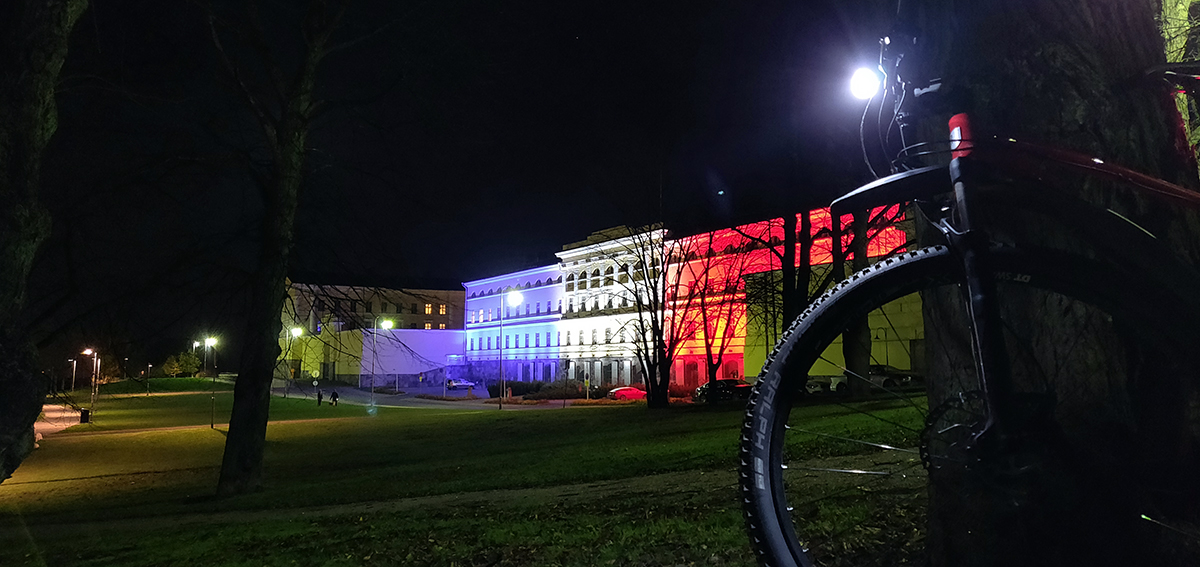 Rastissa 1426 juhlavalaistuksen aiheena ei ole Ranskan kansallispäivä - mutta sehän olikin meille pyöräilyn ystäville ja kestävyysurheilun kuninkaiden ihailijoille selviö - vaan Tshekin tasavallan ja Slovakian satavuotinen itsenäisyys. Tshekkoslovakia itsenäistyi Itävalta-Unkarista 28.10.1918. Merikasarmin merenpuoleisen julkisivun värivalaisut ovat osa ulkoministeriön 100-vuotisjuhlaa ja ne jatkuvat juhlistamalla Puolan (11.11.), Latvian (18.11.) ja Islannin (1.12.) 100-vuotispäiviä.
