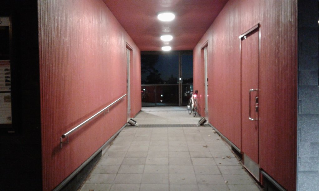 Vanha rasti oli Viikin asukastalo Lava. Vaikka ulkoseinän vaaleus kuvassa meinasi aluksi hämätä niin tuo hassussa paikassa oleva ritilä paljasti. Parvekkeelta avautuu jonkinmoinen näkymä lähialueelle.