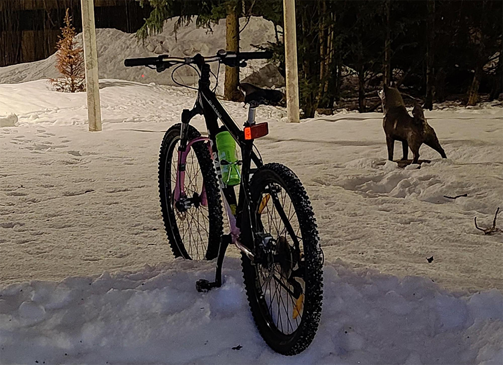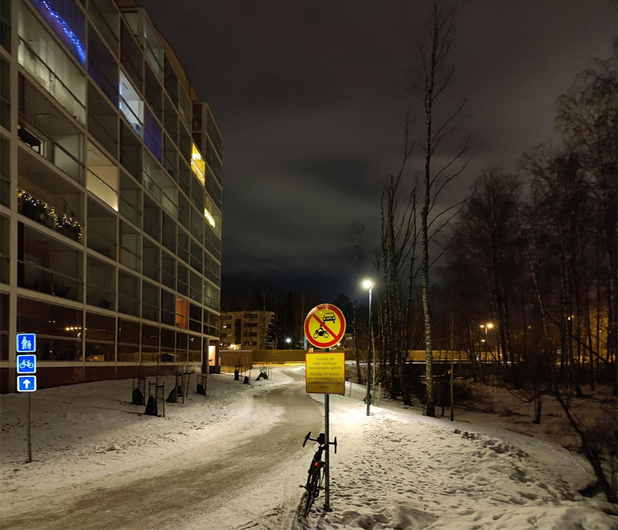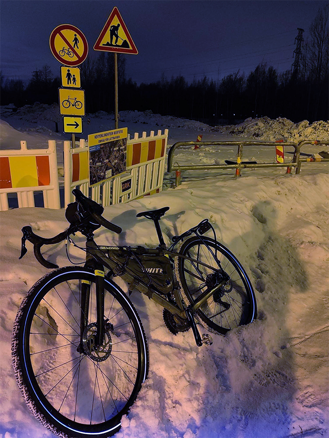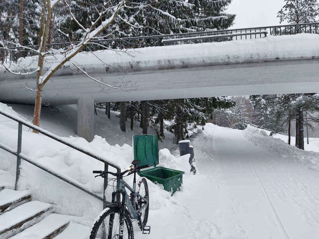 Oli ehkä huonoin ajokeli missä olen ajanut pyörällä vaikka se ei kuvista välitykään. Tuuli todella kovaa ja siten vaakasuoraan sataneet hyvin teräviltä tuntuneet lumipisarat iskeytyivät suojaamattomiin silmiin. Ja ei tuo maahan satanut uusi raskas vaikka ohuehko lumikerroskaan vanhan möykkyisen lumikerroksen päällä vauhdittanut menoa.