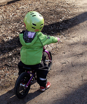 Tyttö on 127cm ja jalan sisämitta 58cm. Satula oli kuvan ala-asennossa liian alhaalla, mutta eiköhän sen ennen ensi kertaa saa nostaa pari senttiä ylemmäksi. Neitsytajo sujui loistavasti sepelin tuomaa lisävahinkoa lukuunottamatta, eli isi pääsi jo ekan kerran renkaan vaihtoon.