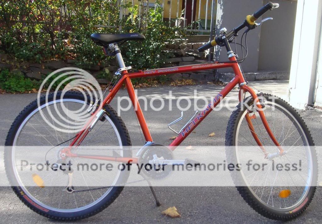 Mikä lasketaan retroksi? Itse arvon lähdenkö finlandian puolimatkalle täysjäykkiksellä, jossa on -97/-98 Tunturi Kayapon runko, orkkis jäykkishaarukka, jarrut, satulatolppa, mutta riser-stonga 90mm stemmillä sekä uudemmat Deore kammet. Orkkis Stx-rc voimansiirtokin on, mutta en ehtisi testaamaan toimiiko, joten jää laittamatta. Punakylkiset vähän ajetut IRC Mythos xc kevlaritkin olis, mutta takarenkaasta on kylki päässyt vanhuuttaan rispaantumaan... (tää pyörä kasattu 2011 lokakuussa pöllityn tilalle)