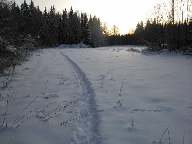 Tänään ei ollut ajettavaa polkua, ei liioin latuakaan mailla halmeilla. Yhteenkään ihmiseen en törmännyt, kun tallustelin osin umpihangessa katsastamassa maastopolulle uutta linjaa ensi kesäksi. Oli vähän helevetin hienoa ulkoilla. Hiki tuli, ja punaiset posket pakkasessa.