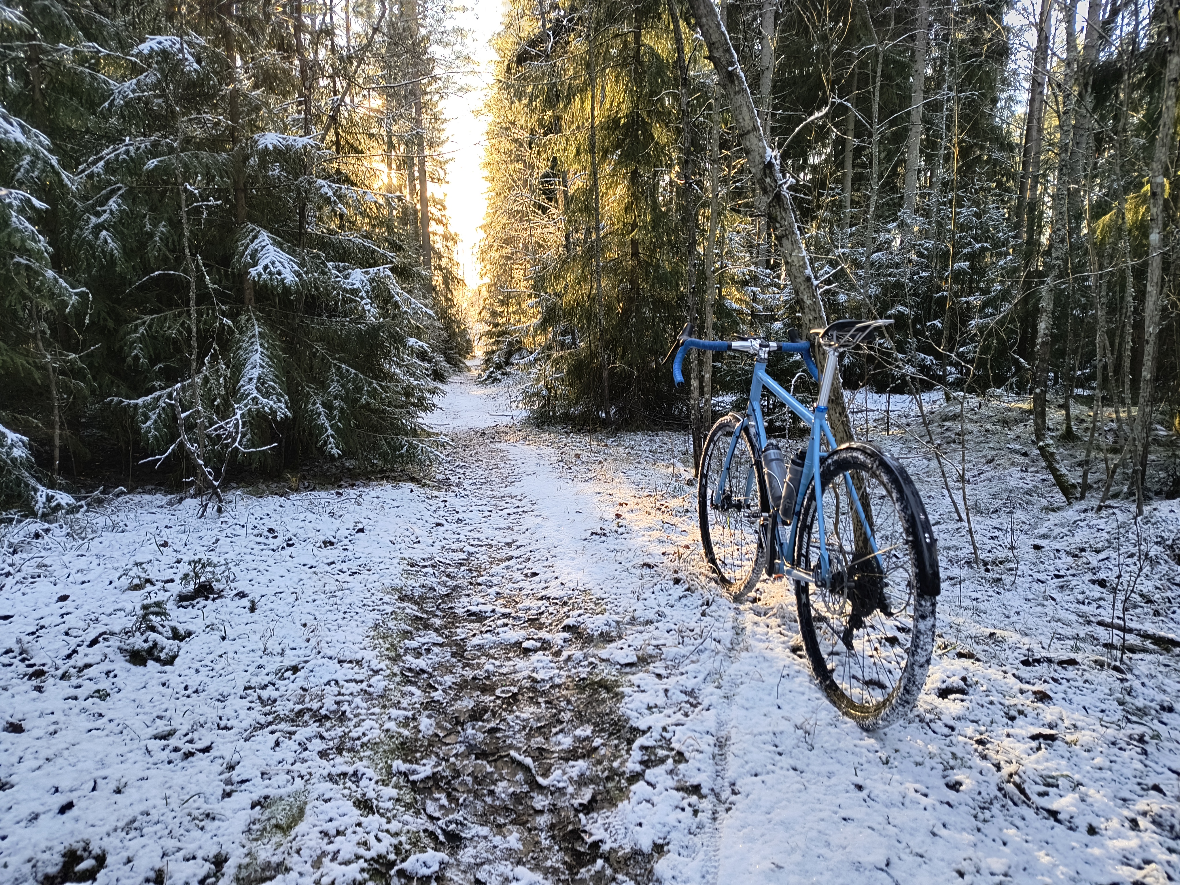 Piti lähteä jäykkäperällä sorateille, mutta päädyinkin metsäpoluille. On kyllä todella hauskaa vaihtelua ajaa jäykkiksellä polkuja. Täysjoustolla järeillä renkailla tottunut siihen, että kaikesta voi vaan jyrätä satulassa istuen yli. Jäykkäperällä taas pitää oikeasti kikkailla ja jumpata esteistä yli. Ihan erilainen tuntuma poluille. Jäykkä keulakin voisi toimia tuossa pyörässä...