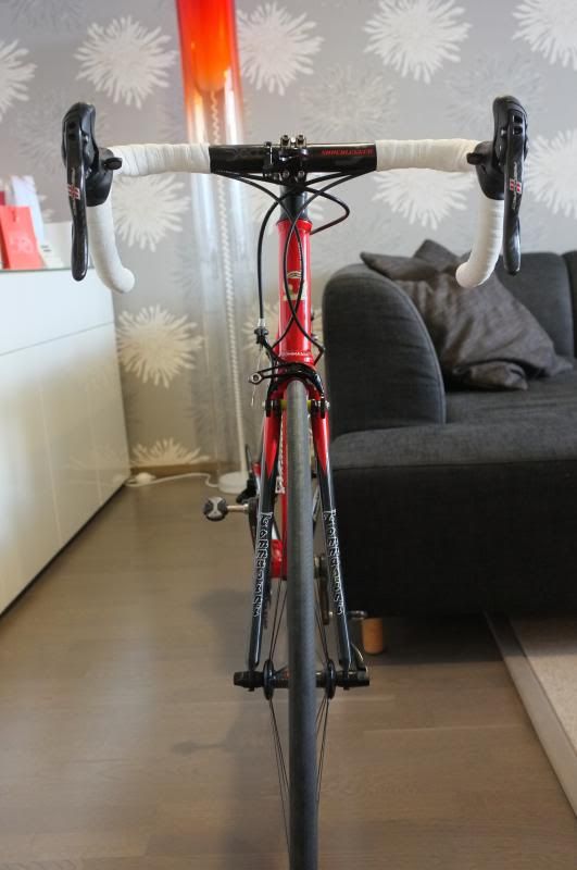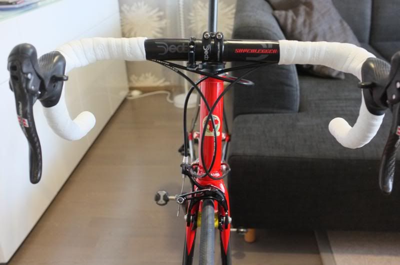 Väri Rosso Ferrari.Vaakaputkesta otettiin vakiogeosta 10 mm pois, droppia maltilliset 80mm (pidempään elämästä nauttinut, lyhytselkäinen mies).