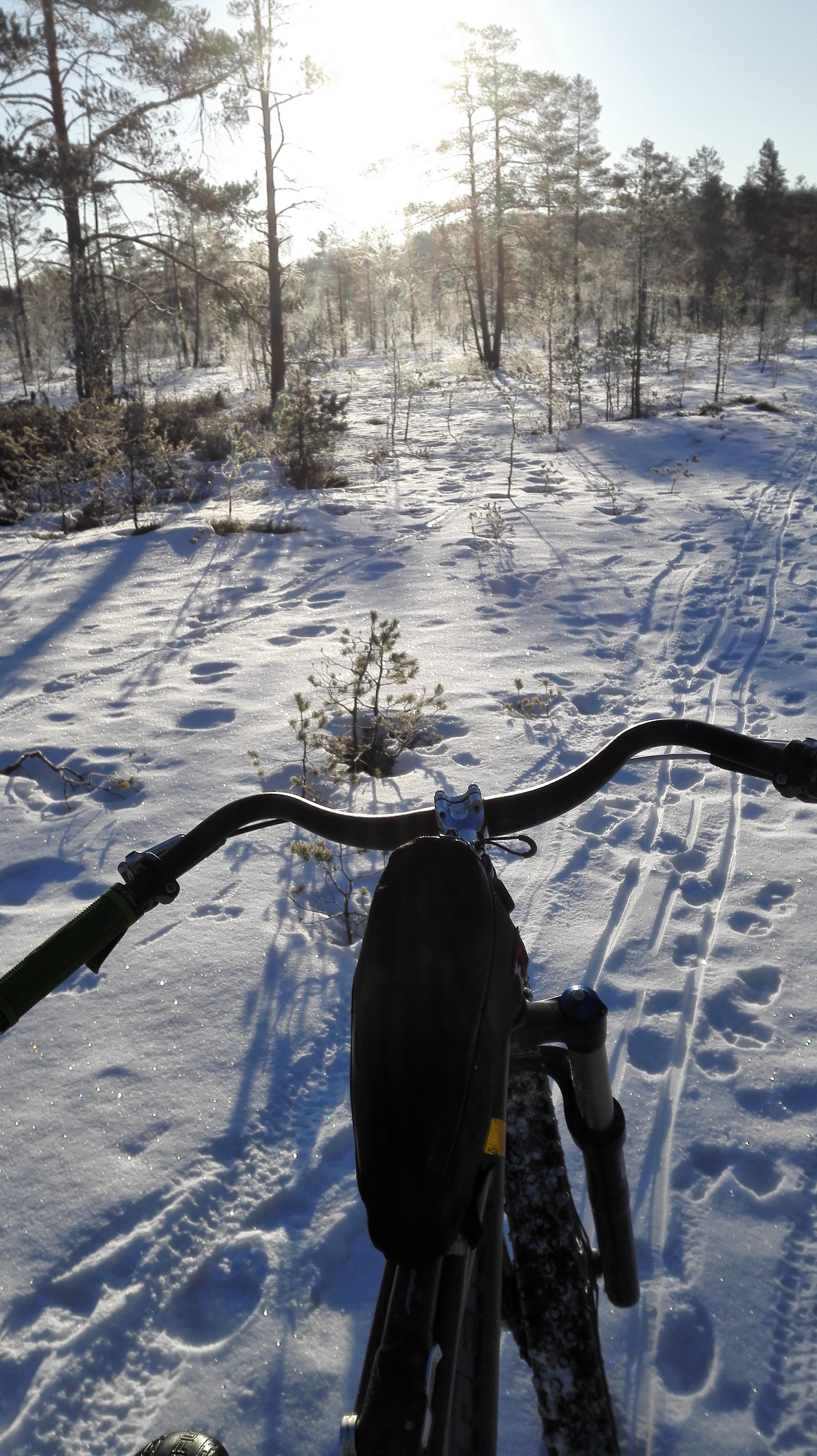 Kuva vähän kaunistaa todellisuutta. Pääosin toi oli ihan hyvää, mutta välillä renkaat tipahteli muutaman sentin lumen sisään. Jossain vaiheessa olikin pakko tunkata kun loppui voimat :)