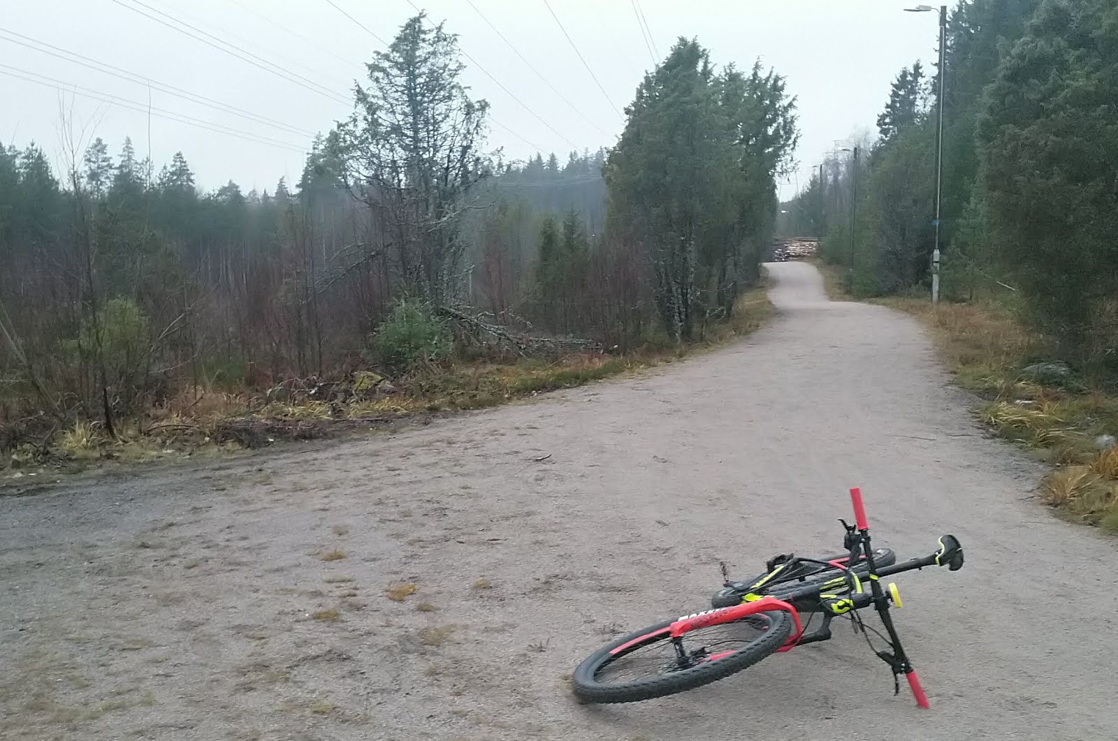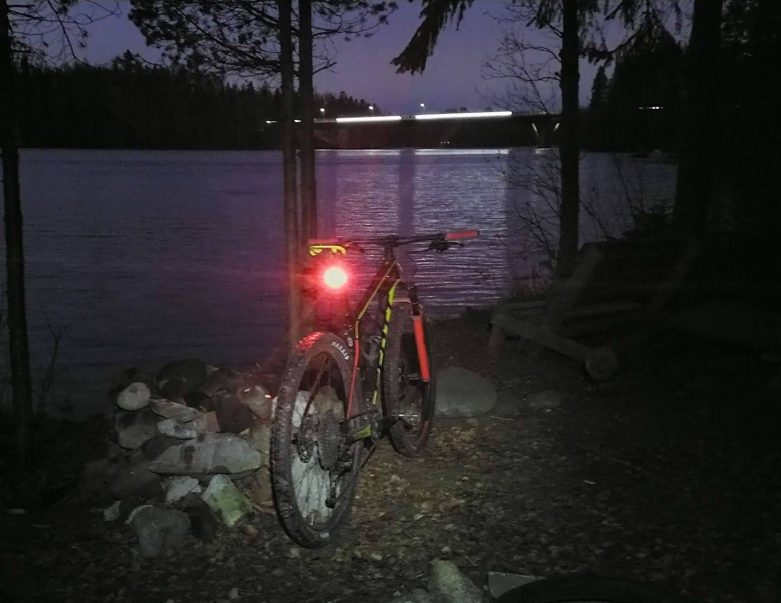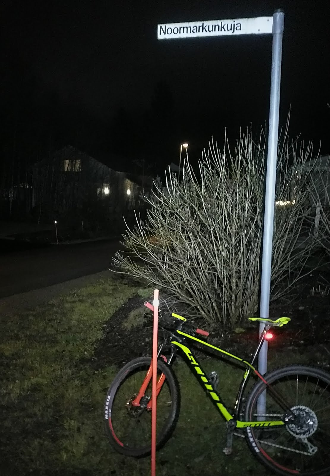 Rasti ei hienosta viikonlopusta huolimatta liikkunut, joten laitetaan varmuuden vuoksi vähän vinkkiä. Ensimmäisenä vinkkinä se, että kuvassa on maantiepyörä, eli kovin syvältä metsästä kyseistä nuotiorinkiä ei kannata etsiä. Itse asiassa kuvan taustalla näkyvä kellertävä alue on valaistu asfalttitie, ja lähin asfaltoitu pyörätie kulkee noin metrin päässä kuvaajan selän takana. Kyseessä vieläpä niin yleisesti käytetty reitti, että veikkaan jokaisen tätä ketjua seuraavan ajaneen tuosta vierestä ohi moneen kertaan. Ja nuotiorinki näkyy jopa Googlen street viewissä.