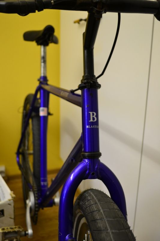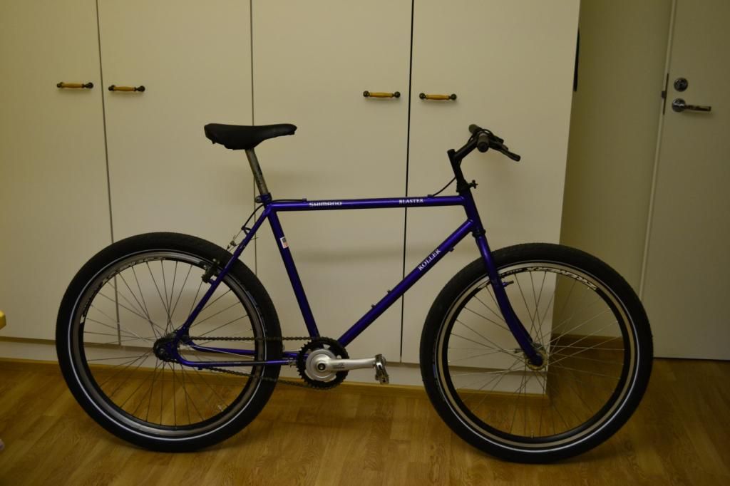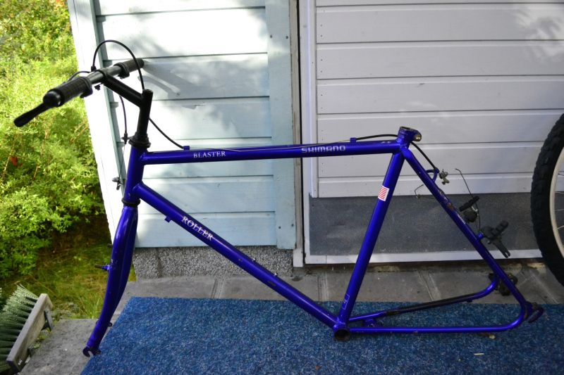 Resepti: Otetaan 3x6-vaihteistoinen ysärimaasturi BLASTER ROLLER, jonka lankomies oli aikanaan ostanut 800 markalla ja ajanut kaikki pyörivät osat loppuun. Hyvät semi-horisontaali-dropoutit, 128-millinen takaväli, kiva sininen metallikiiltoväri. Käytetään tohoa, hitsiä ja lekaa keskiön irrottamiseen. Muut osat sentään lähti helpommin. Lisätään toisesta puretusta romu-"täysjoustosta" otetut "Kremerx"-kiekot (yllättävän hyvät!), Schwalbe Big Apple 60-milliset renkaat (noilla vanteilla todellinen leveys vain 54 mm), Pyörätohtorilta ostetut Batavus-kammet ja joku BMX-vapaaratas. SRAM PC-1 -ketjut. 113-millinen keskiö. Paukutetaan hieman vasaralla chainstay-putkea sisään että mahtuu 38-hampainen ratas pyörimään. Tehdään takakiekolle pientä re-dishiä kiristämällä ei-vetopuolen pinnat. Näin ketjulinja saadaan suoraksi.