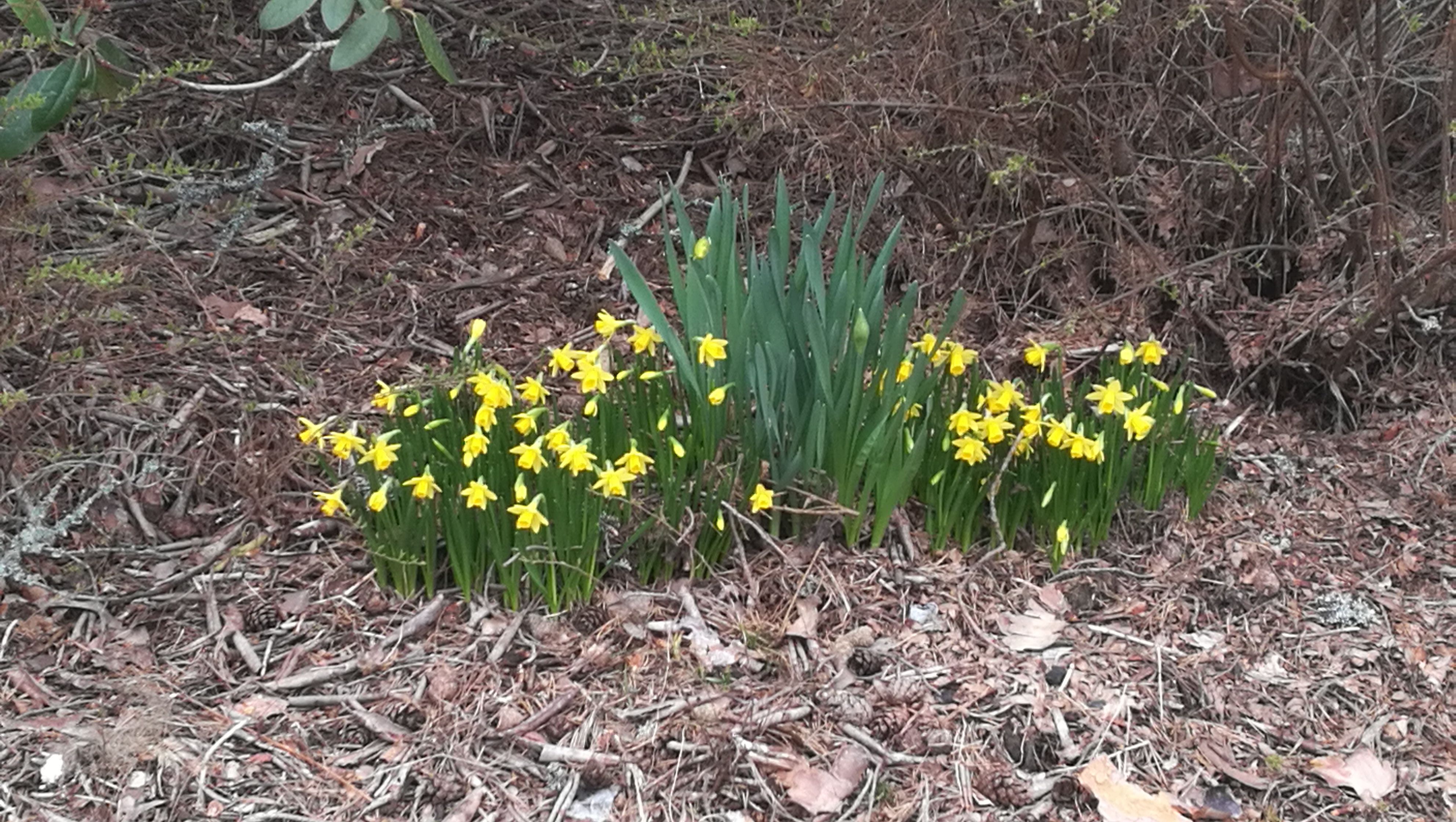 Keskellä olevat pidemmät hujopit ovat perunanarsisseja ja ovat vasta nupuillaan.