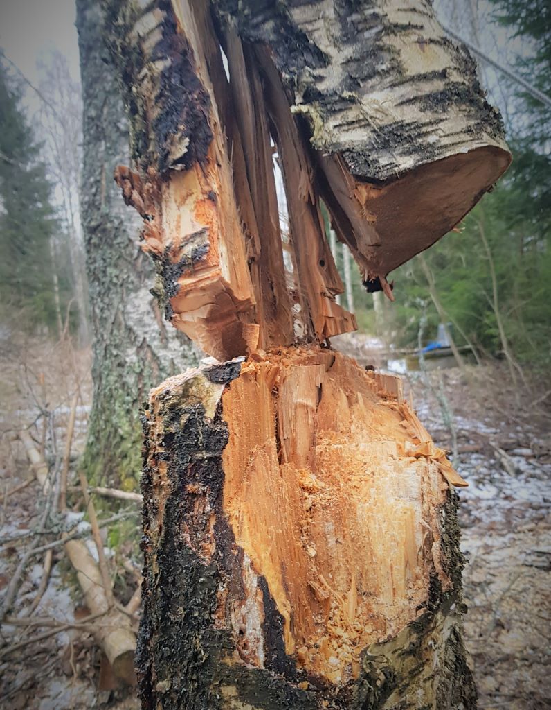 Tää olis kaatunut päälle jos ei olisi ollut toinen puu edessä (joka muuten on oikeasti laho kun oksia tippuu). Tuon lahoudesta ei ollut mitään aavistusta.