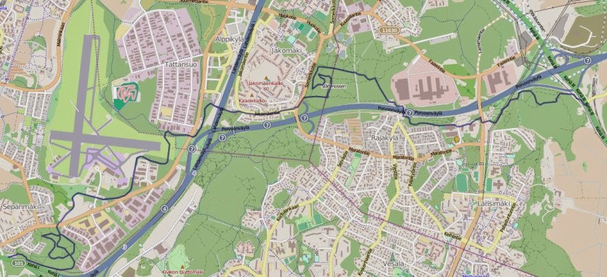 Katselin karttaa pikaisesti sillä oletuksella, että jossain edellisen rastin lähistöllä oletettavasti ollaan. Tuttuja maastoja ei juuri alueella ole. Koska Malmin lentokentästä toistuvasti puhutaan upottavana suona, ajattelin pitkospuiden ehkä löytyvän sen laidalta. Haku sanoilla malmi pitkospuut nosti esiin sopivan merkinnän Yksiraide-blogista.