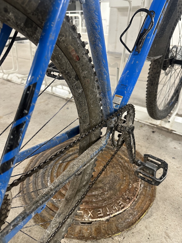Tältä näyttää pyörä, kun on Larun siltaa, baanaa ja radan vartta ajanut parina päivänä eikä ole muistanut huuhdella sitä sen jälkeen. Ihan hirveetä skeidaa toi suolaliuoksen käyttö. On tullut toimiston pyöräkellarissa parkkeerattua pyörä aina samaan paikkaan ja siinä on tollanen valurautainen kaivon kansi alla. Saa nähä onko siitä enää mitään jäljellä talven jälkeen, kun pyörän sulamisvesien suola tuhoaa sen. :D