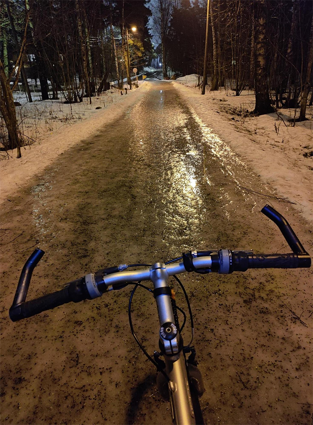 Oli ehkä huonoin ajokeli missä olen ajanut pyörällä vaikka se ei kuvista välitykään. Tuuli todella kovaa ja siten vaakasuoraan sataneet hyvin teräviltä tuntuneet lumipisarat iskeytyivät suojaamattomiin silmiin. Ja ei tuo maahan satanut uusi raskas vaikka ohuehko lumikerroskaan vanhan möykkyisen lumikerroksen päällä vauhdittanut menoa.