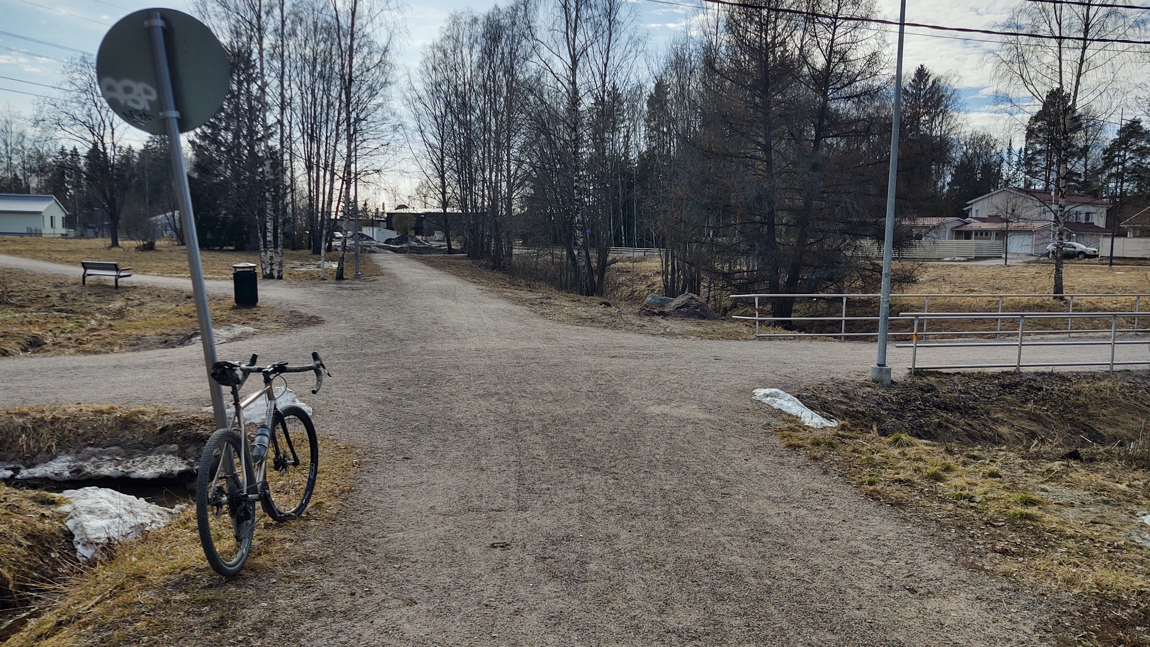 Maastopyörälenkkiä sai ajaa pitkään, ainakin 10m, ennen kuin tuli oikean näköinen kohta. Oli sen verran pehmeätä ja urille ajettu, ettei kovin pitkään viitsinyt kiertää.