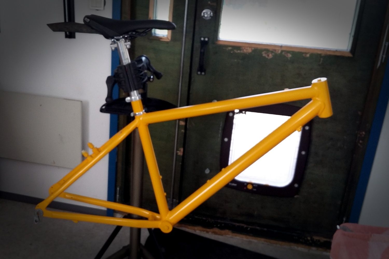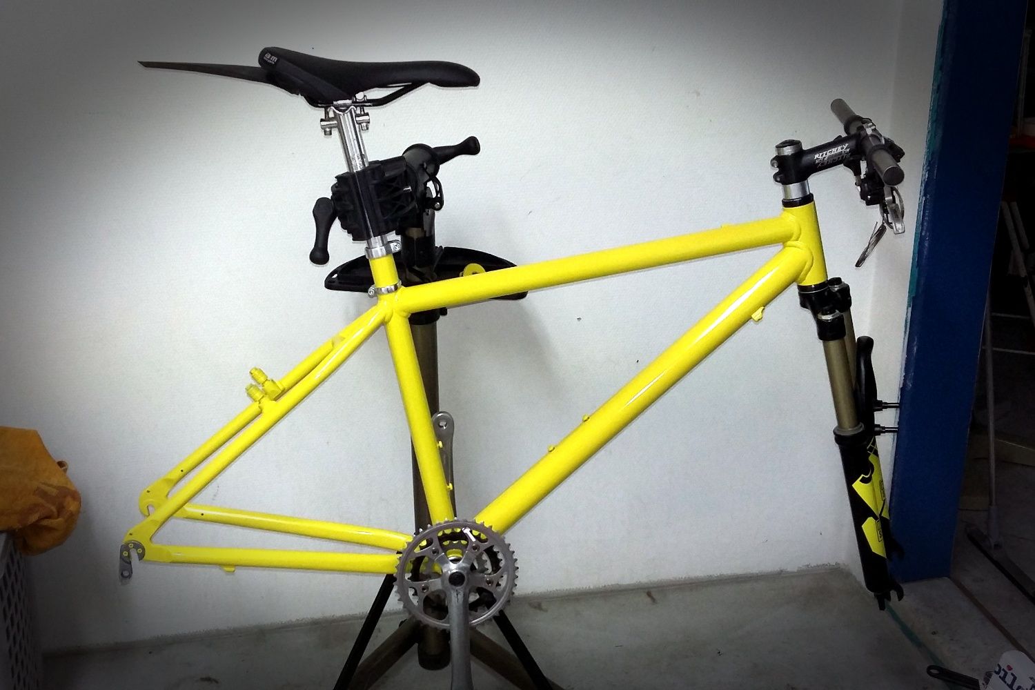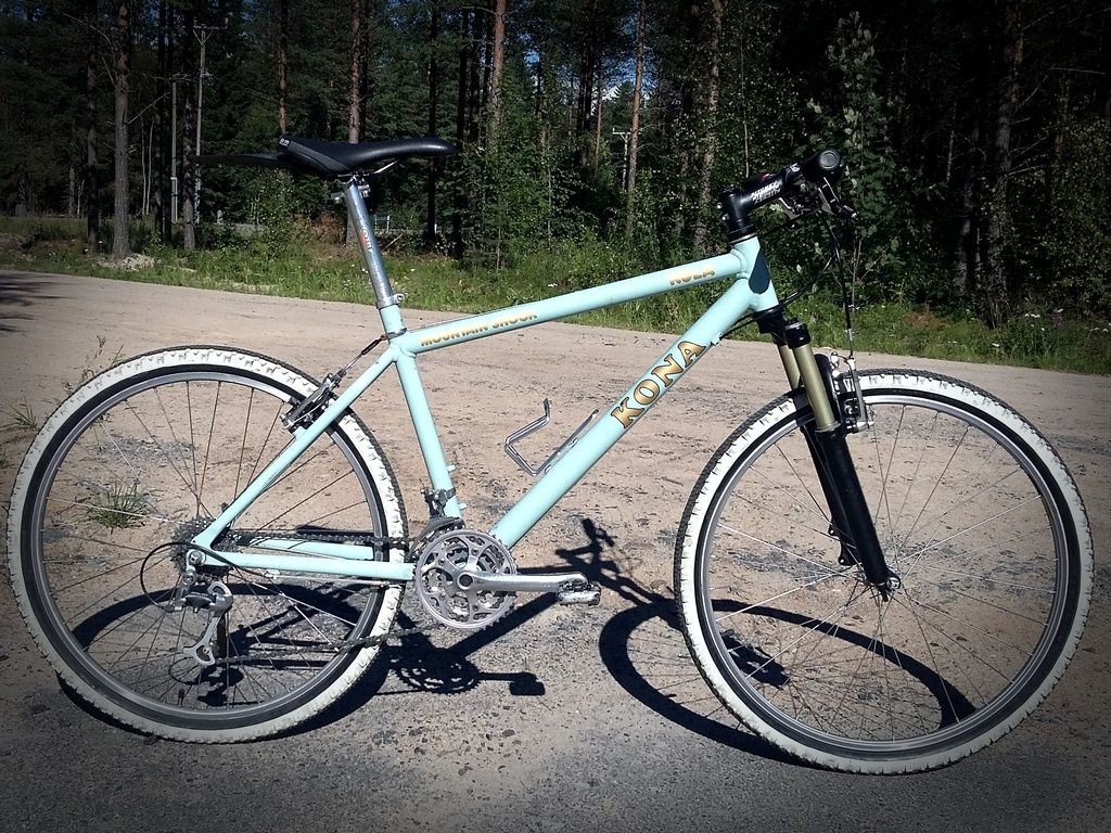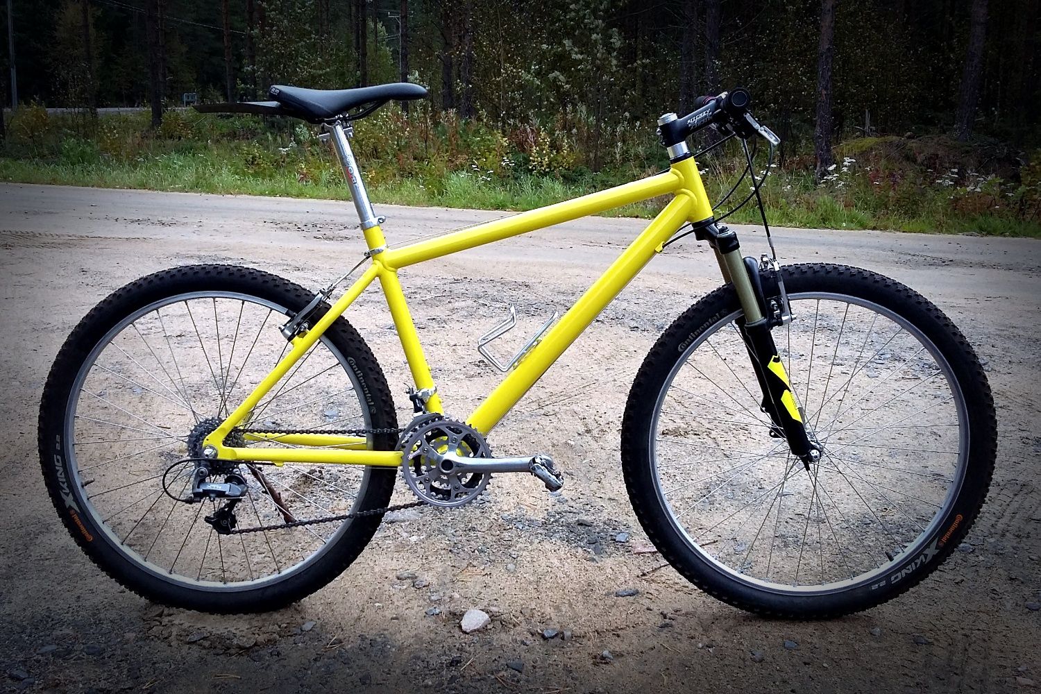 Pyörähän oli alkup osilla, niihin tein semmoset pikku muutoksen että takavaihtaja vaihtui XT > XTR ja shifterit (Suntour)+jarrukahvat (Kona) > XT-komboihin. Keulaksi oli aikasemmin jo vaihtunut vanha RS SID ja jarruiksi XT v-jarrut. Vielä kun tulee orkkistarrat niin ois valmis.