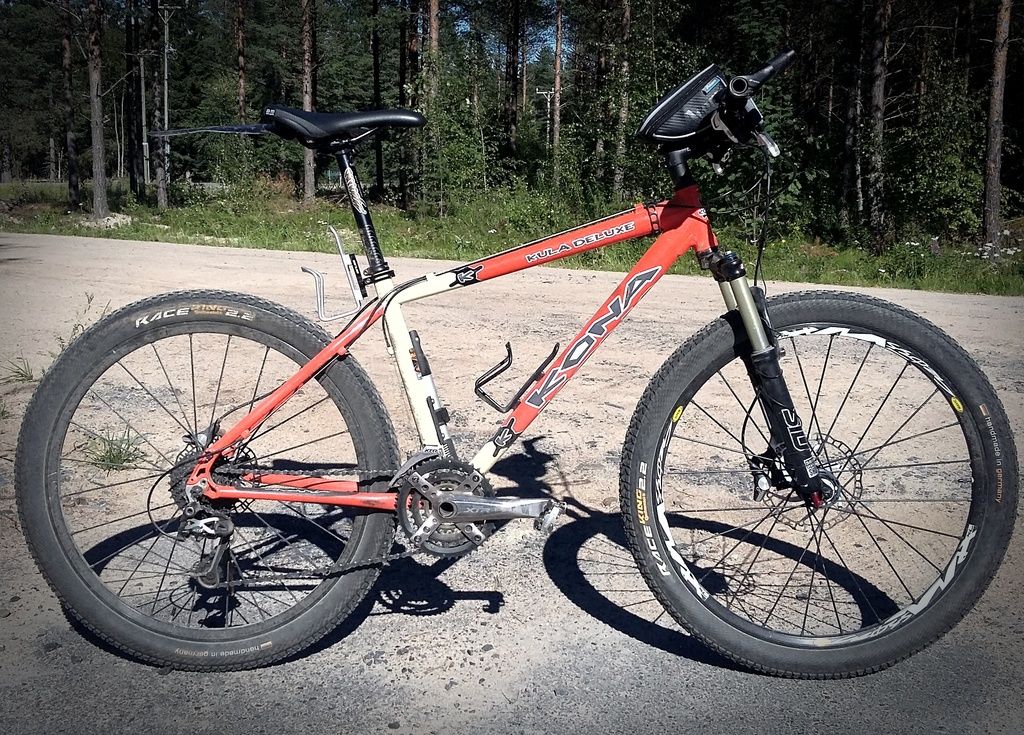Ei ole mikään mannekiinikuva, mutta tuo kota oli hieno. Eikä taida Rosthairsissakaan olla mitään varsinaisesti uutta - lukuunottamatta sitä, että satula taitaa olla vaihtunut sitten edellisen kuvan ja palasin takaisin teräshaarukkaan. Niin sitten on tosiaan se ruostereikä, joka on toistaiseksi ollut nyt muutaman kuukauden vain epoksilla paikattu. Kasassa runko on pysynyt reiästä huolimatta, vaikka olen chainstaytä yrittänyt saada katkeamaan droppailemalla ja ylämäkivedoilla, mutta en ole toistaiseksi siinä onnistunut. Siinä muuten yksi hyvä syy, miksi teräs. Lopullista ratkaisua korjaamisen suhteen en ole vielä tehnyt, mutta uusi runko "Norosthairs" on jo tilauksessa. Tärkein eli väri pitäisi vielä päättää..