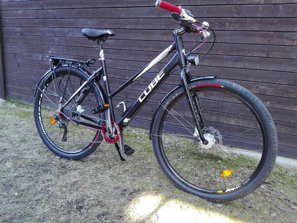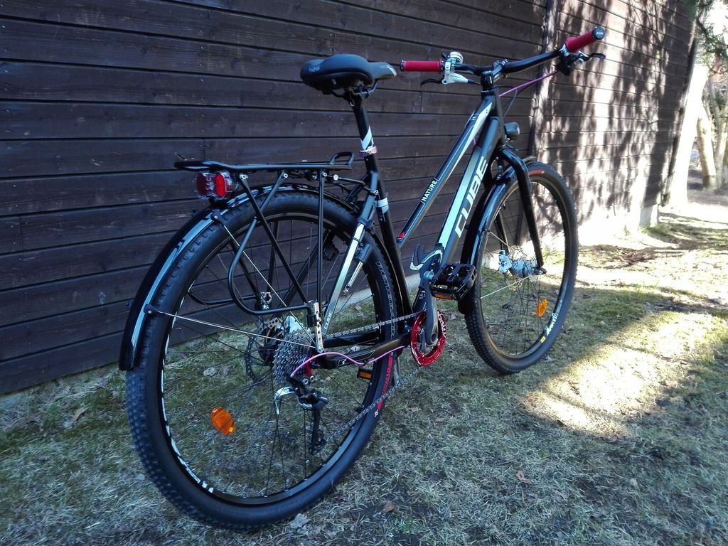Vaimolle ajattelin pyörän kasailla, kun osia oli jonkun verran jäänyt laatikkoon (takakiekko, keula, tanko, voimansiirron osia yms.) Eipä siihen muuta tarvittu kuin viidenkympin poistorunko Bike-Discountista, ja vähän satulaa ja putkiosaa kaveriksi. Dynamokiekon kasailin osista. 1*10 voimasiirto tuli päivitykseen menneestä pojan pyörästä ja Shimanon M396 levarit kaveriksi. Maastopyörää ei siis halunnut, vaan hybridin mutta ahdoin joka tapauksessa runkoon Spessun S-Works Renegadet renkaiksi, jos ilmatila toisi vähän mukavuutta matkantekoon.
