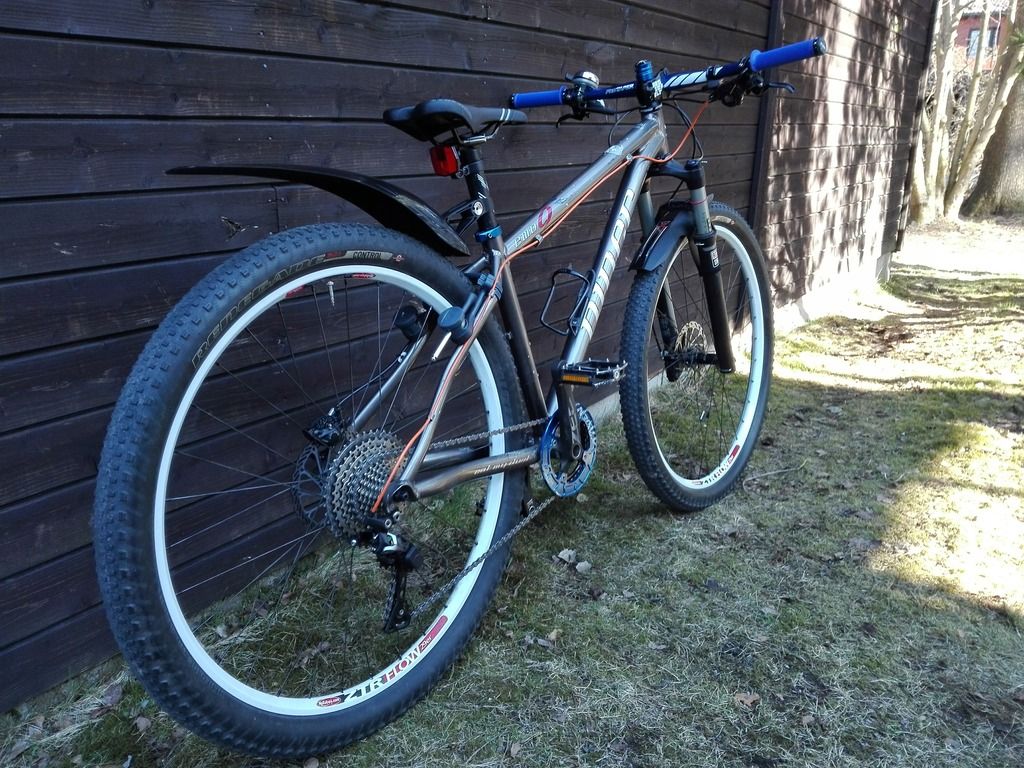Pojalle piti sitten kanssa saada uusi pyörä, koska vanha kävi ahtaaksi. Lähtökohtana oli viime syksynä haltuun ajautunut ilmeisesti jossain vaiheessa Keravan suunnallakin eräällä palstapersoonalla menopelinä ollut Niner EMD 9. Runko oli aika valmiissa kunnossa ulkonäöllisesti, eli lommoja ja lohkeillutta maalipintaa riitti, mutta rakenteellisesti kuitenkin ehjä. Keräilin osia sieltä täältä pitkin talvea: Rokkarin Reba, XT jarrut ja SLX/XT 1x11 voimaansiirto Zeen kammilla.