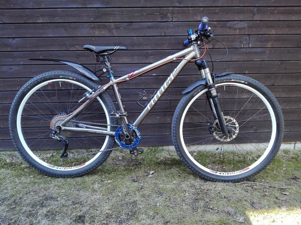 Tytön pyörää tuli viriteltyä kovasti. Voimansiirtona 1x10, keulana huollettu 2005/2006 mallinen Manitou R7, jotain parempaa v-jarrua tuossa on ja keviämpää putkiosaa.