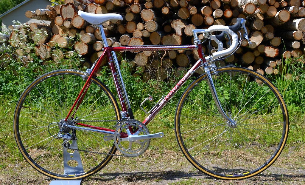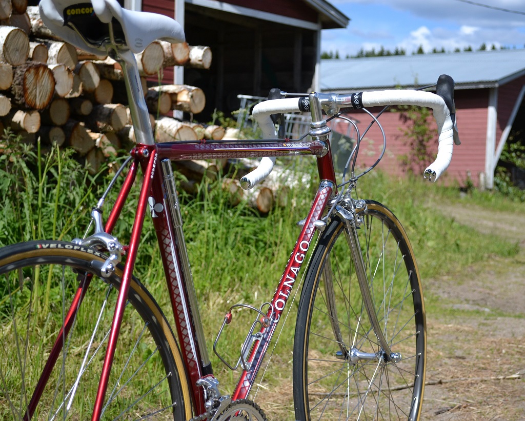 Colnago löyty todella edullisella hinnalla pari vuotta sit, kun yhden vanhan pariskunnan poika oli laittanut myyntiin "rojua" autotallista. Ennen varsinaista kauppaa piti juoda kahveet ja syödä graavilohileivät valmiiksi katetussa pöydässä rupattelun ohella. Harvoin tälläisiä myyntihetkiä tulee nykyisin. :) Kuulemma nuo Shimanon STI-vaihtajat olivat tulleet juuri markkinoille ja joutui tilaamaan Ruotsista, kun Suomessa kukaan ei niitä myynyt. Runko oli ostettu jostakin Länsi-Tampereen pyöräliikkeestä. Mukana tuli kahdet kiekot DA takapakalla.