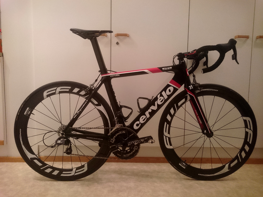 Ensimmäinen maantiepyörä. Cervelo S2 vm 2012. Kahvat Sram 10sp Rival, muuten osat Force22. Hieman joutuu kikkailemaan noiden 10sp kahvojen kanssa 11sp takavaihtajalla, kun vetosuhde aavistuksen erilainen. Kiekot FFWD F6R. Paino ilman mitään erikoisia osia aikalailla tasan 7kg. Sain veljen aloitettua maantiepyöräilyn tällä pyörällä tänä kesänä joten itse ei tule tällä pahemmin ajettua. Pahoittelen huonoa kuvaa...