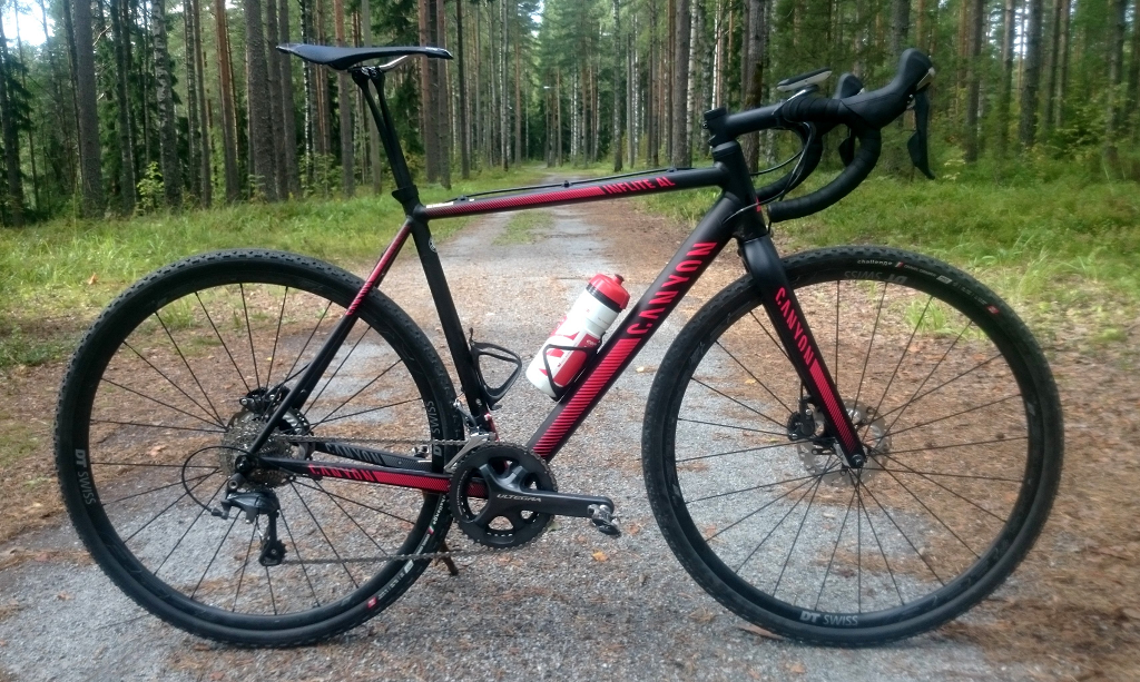 Canyon Inflite 9.0 vm 2015. Satula vaihtunut Rotoriin, stemmi 110mm Ritchey WCS mistä poistettu maalit ja renkaat 38mm (40mm vanteella) Challenge Gravel Grinder. Lähinnä hiekkateitä tulee ajettua niin rullaa kivasti ja asfalttisiirtymillä todella mukavat. Oikeat cycloajot jääneet vähemmälle. Muuten originaalissa kunnossa Ultegralla ja hydraulisilla jarruilla. Paino 9,1kg