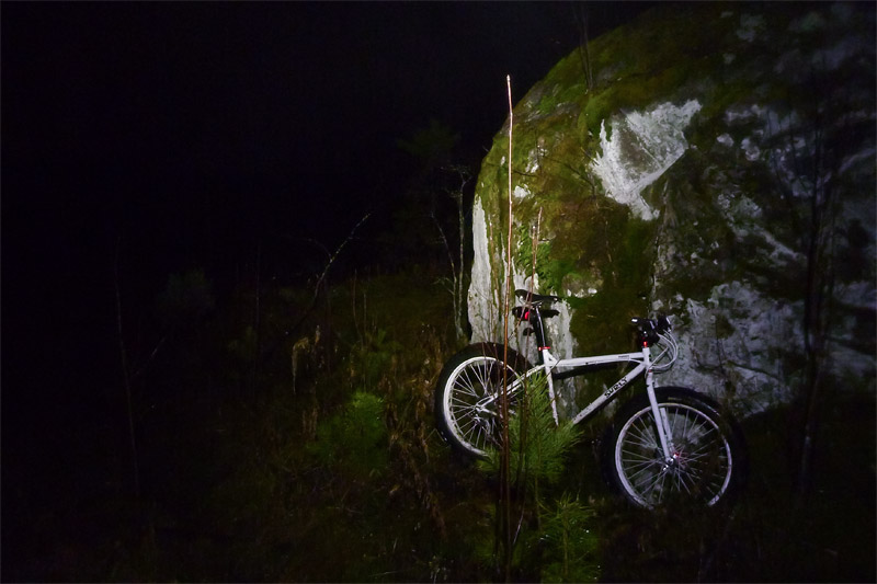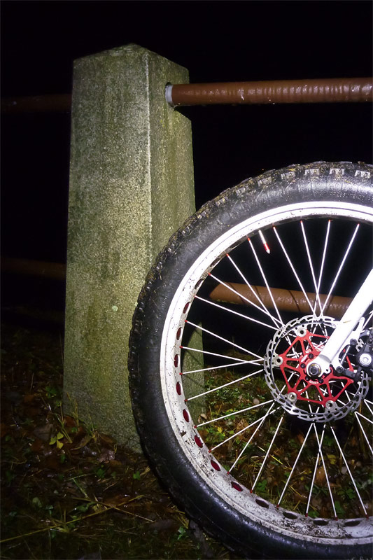 Paikka löytyi, mut kuvassa ei näy renkaiden heijastimien lisäksi muuta kuin mustaa... Kiitos siitä hyvälle kuvaaja-kamera-yhdistelmälle. :D