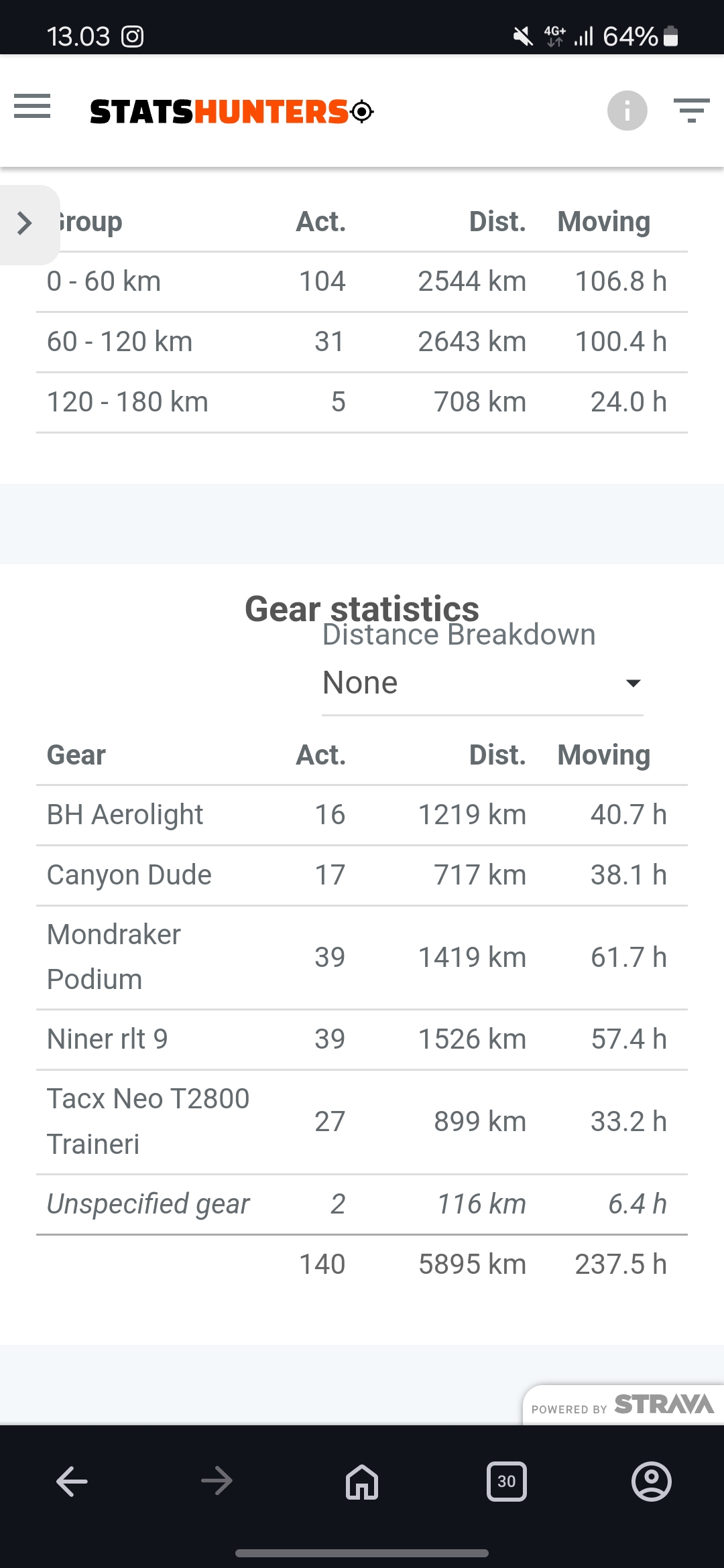 Sorttaan sitten lenkkejä tuolta statshunterista pyörän mukaan, kun mtb, gravel ja road ei ole käytössä.