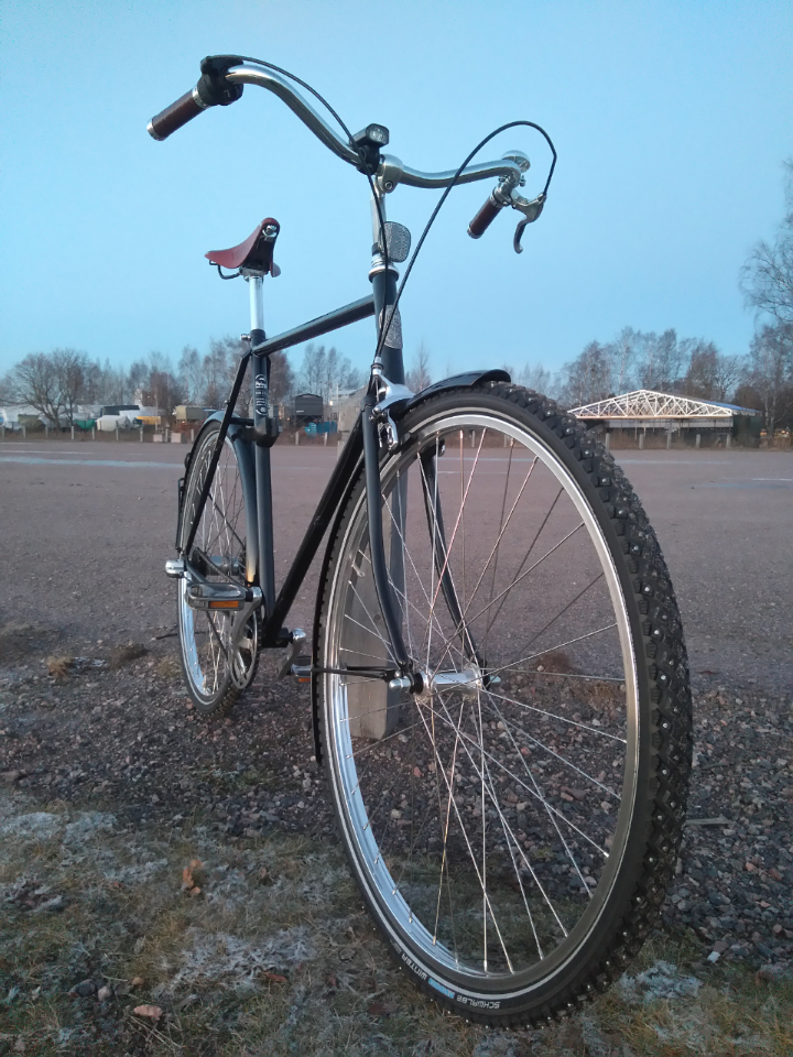 Terve! Tässä tällainen herrasmiespyörä talvivarusteissa. 42-milliset nastarenkaat meni vielä vaikka Pelagon mukaan lokareiden kanssa raja on 37.