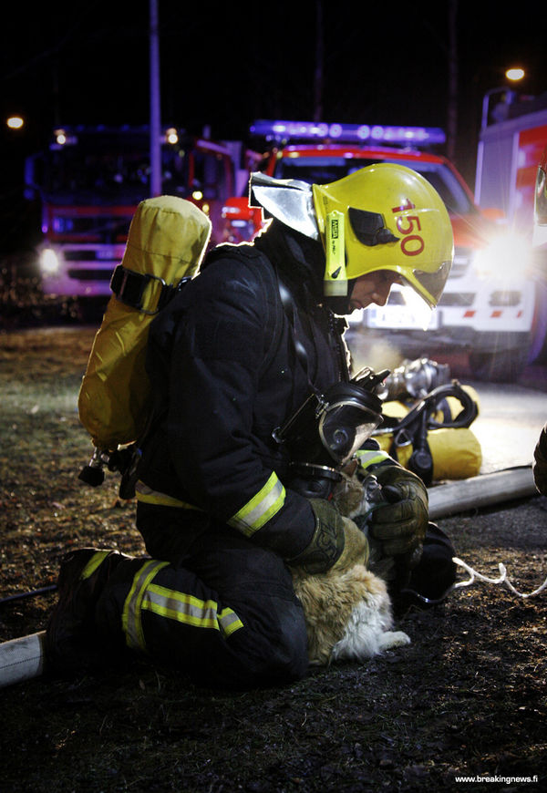 Tähän väliin toisenlainen kissakuva. Asuntopalosta pelastetulle kissalle annetaan lisähappea. Katti sai kuulemma nesteytystä myöhemmin pieneläinklinikalla ja selvisi koettelemuksesta.