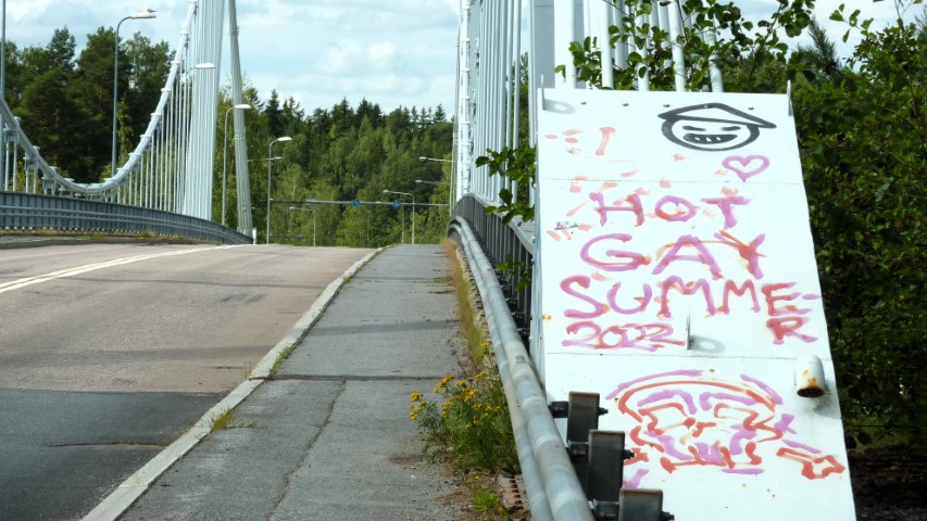 Suurin kiukku on etelään päin pyöräillessäni Sääksmäen riippusillan vaijeriankkuripesän [töherrysteksti: GAY SUMMER] eteen pysäköidyt autot, sillä tapaa, että joutuupi koukkaamaan ajoradan puolella vanhalla Vt3:lle, nykyiselle St130:lle. Myöskään niitä karikatyyrejä aasialaisista kartiomaisella päähineellä ei ole vieläkään ylimaalattu. Näitä näkyy olevan Vt3:n moottoritielläkin kaivorenkaissa.