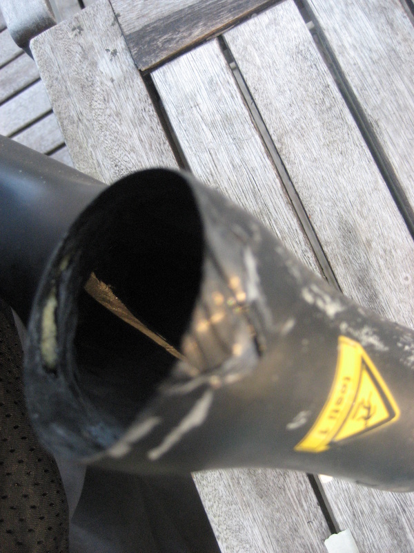 Tähän ns. integroituun ohjainlaakeriin alkoi ilmaantua väljyyttä. Kiristäminen ei auttanut. Eipä ihme, koska hiilikuiturunkoon, ohjainputken ylä- ja alapäähän ympätyt metalliset kupit ovat irronneet hiilikuidusta ja kiristäessä yläkuppi alkaa jo painua alas runkoon. Kuvassa näkyy, kuinka kupin takareuna painui kevyesti kiristettäessä alas. Laakerin yläsuojus on jo repinut hiilikuitua rumaksi.