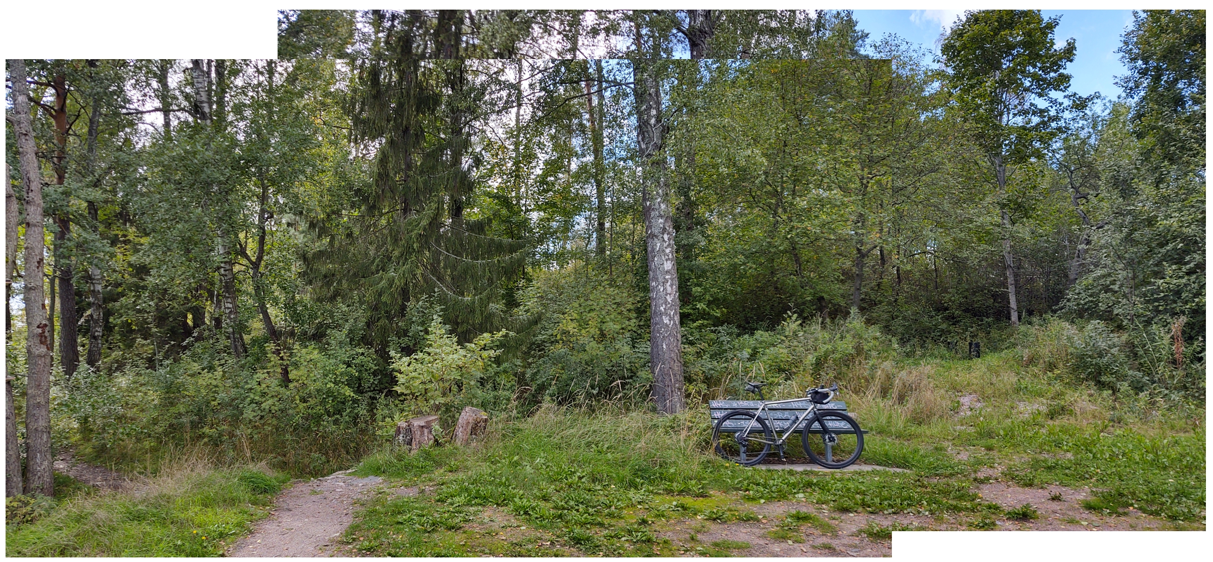 EDIT: Jo aiemmasta kuvasta saattoi hahmottaa kymmenkunta erilaista puulajia, vähän poluntynkää, vaikutelman jonkunlaisesta mäestä ja kaksi mustaa putkea. Ei riitä minun hoksottimillani.