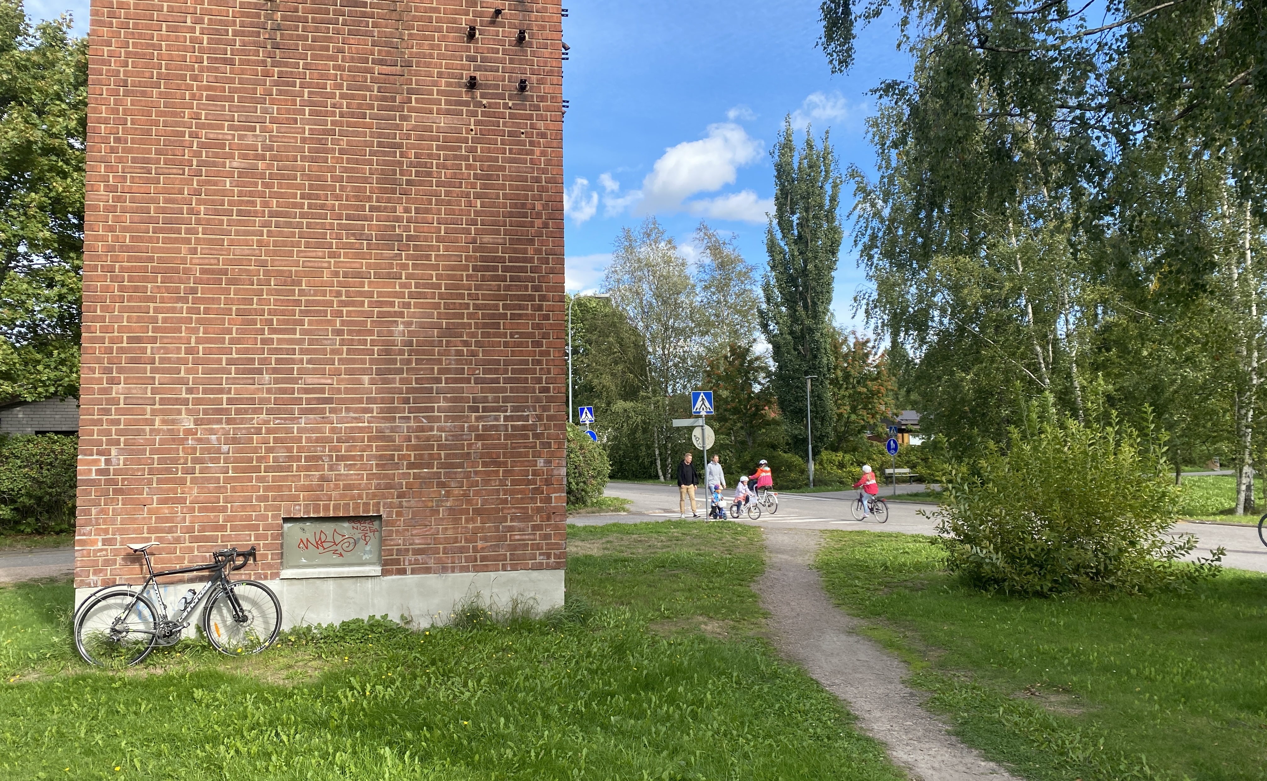 Rastin löytymisen kannalta ratkaisevaa oli huomata ajoratamaalaus, joka vihjaisi kiertoliittymästä. Tästä sain ajatuksen hakea seuraavaksi rastiksi jotain pyöreää - tosin lopputuloksessa yhdistellään myös naapurirakennuksen kulmikkuutta.