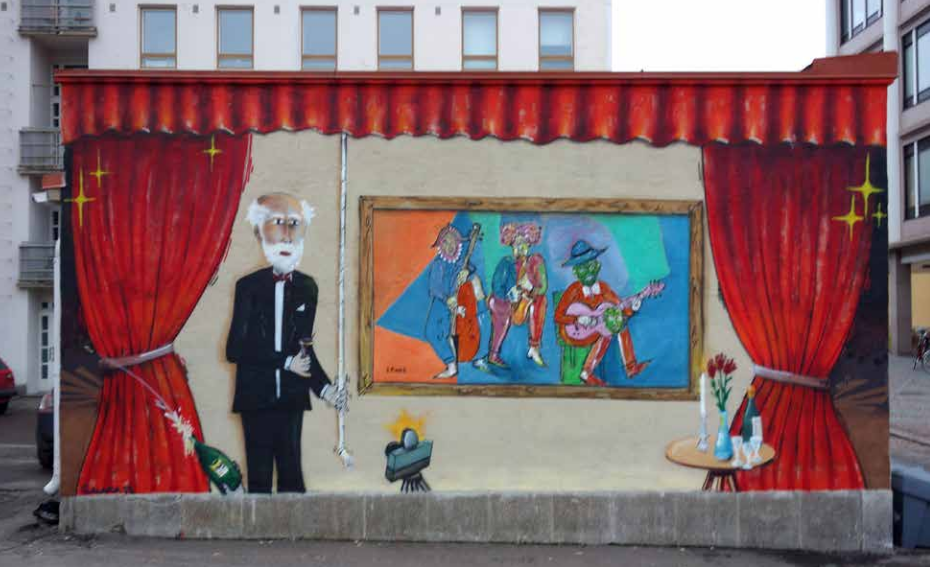 Maalauksen gallerian päätyseinään tekivät Miss Kompro (Elli Ikonen) ja Janika Salonen elokuussa 2017 Lahden taidelauantaina (joka tänä vuonna pidetään syyskuun 1. pvä). Katutaiteen olemukseen taitaa oleellisesti kuulua ettei se ole pitkäikäistä - tosin Lahdesta saa yleensäkin sen vaikutelman ettei siellämikään kovin ikuista olekaan, paitsi radiomastot ja hyppyrimäet - mutta jäihän alkuperäisestä seinämaalauksesta sentään kuvia: