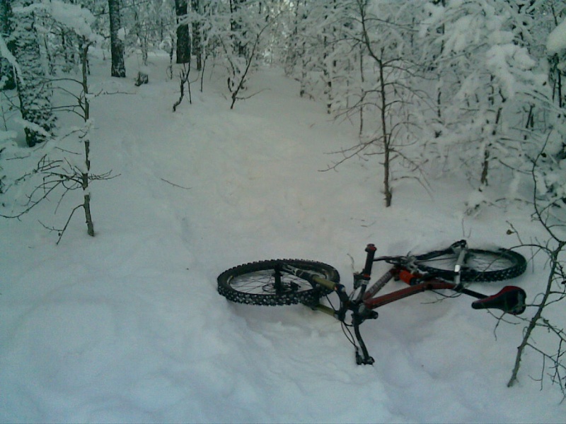 Cyclolla koitin pysyä maasturin perässä lumisella polulla. Tulos: n. 25 vauhdilla hankeen lento yli tangon. Siitä noin sata metriä ja pyörä päin puuta ..ja mies liukui pari metriä pyöräuraa. Jos silloin olisi joku tullut ja tarjonnut euron pyörästä ni olisi mennyt kaupan.