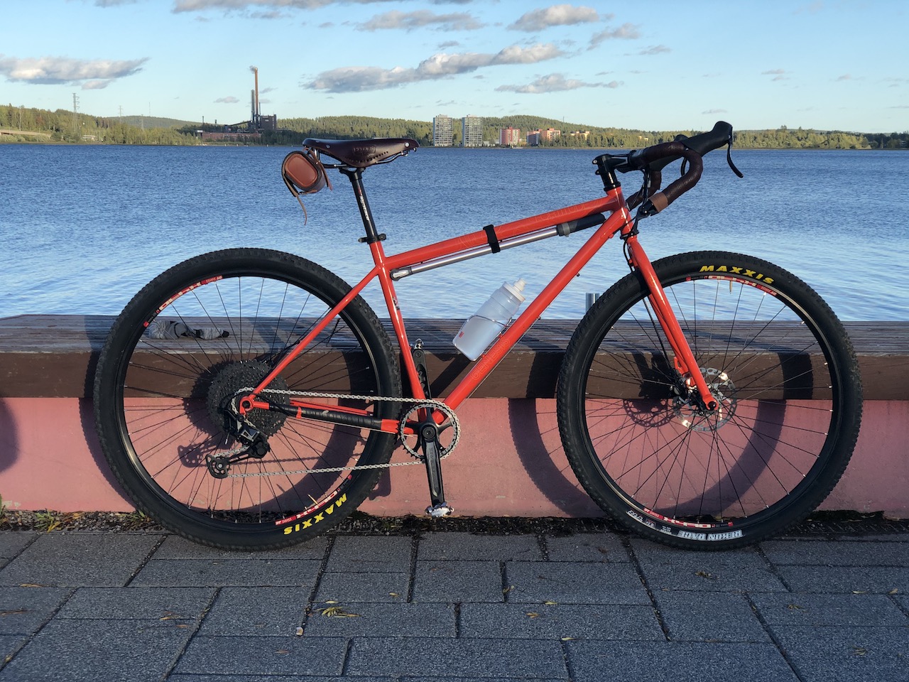 Droppitankograiveli piti kuitenkin vielä tälle syksylle saada, kun tilauksessa oleva Gravel-runko valmistuu vasta talven tullessa. Otin työn alle vanhan kommuutterina palvelevan teräsmaasturin ja vaihtelin osia tallin muista fillareista + jarrut, tangon ja microshiftin vaihtajan tilasin. Tuli tämmönen monstergravel. Nyt eka kokeilu pikku lenkki pururataa ja vähän tien päällä. Toimii geometria paremmin. Ehkä sentin lyhyempi stemmi ja rullaavammat renkaat. Nyt ei rullaa asfaltilla mihinkään, eikä muuten ole aero. Hiilarikeulan vois vaihtaa jos jostain löytäis suoralla kaulaputkella sopivan, tuo alkuperäinen painaa toista kiloa.