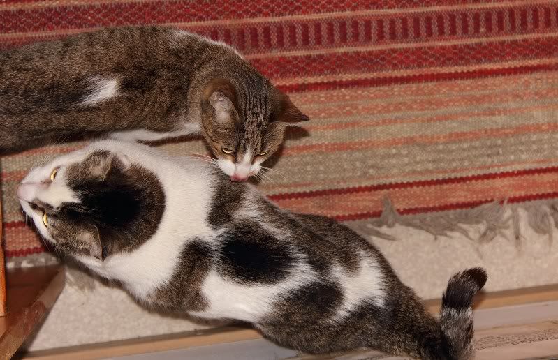 Ihanat, tarkastaja ja tarkastajan kaveri :) Kertakaikkisen hyvä otos tuo narunpään tavoittelu. Raskaan näköinen kissa ja noin kevyen näköisesti se hipsuttelee takajaloillaan :), kuin mikäkin balleriina.