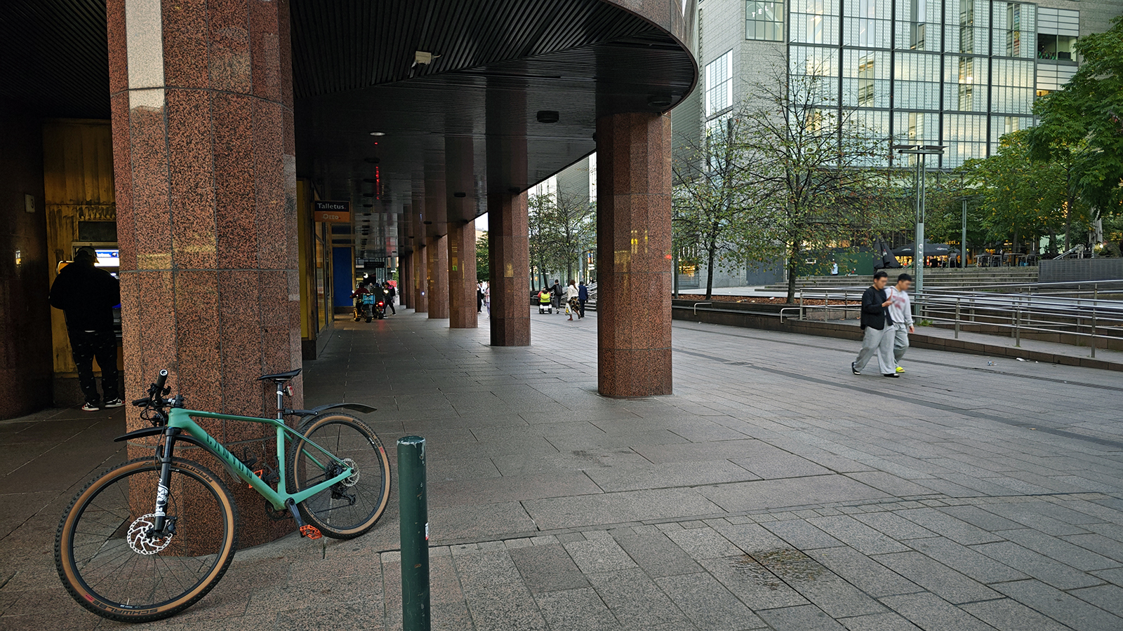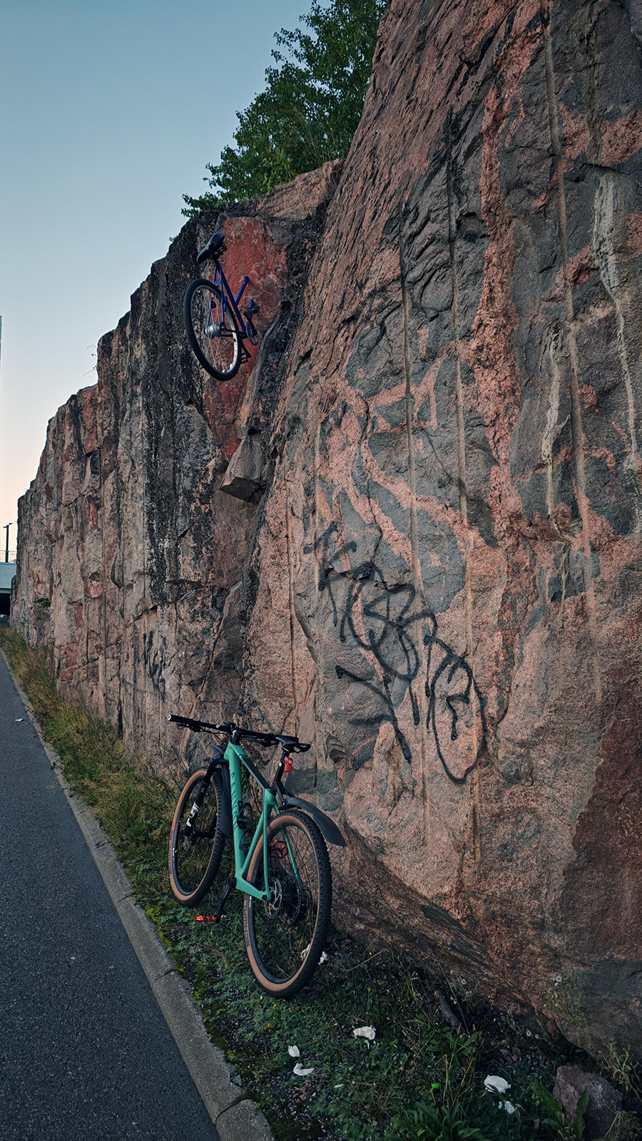 Graniittia ja pyörä. Rasti 2533 oli Graniittitalon Jaakonkadun ja Salomonkadun kulma.