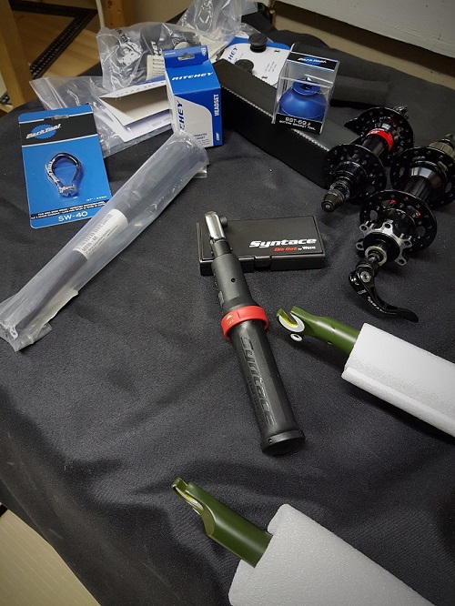 Kaikkea pikkuosaa tuli, mutta ei näistä vielä pyörää kasata. Eroottisin on tietysti tuo momenttisauva kuvan keskellä. :o